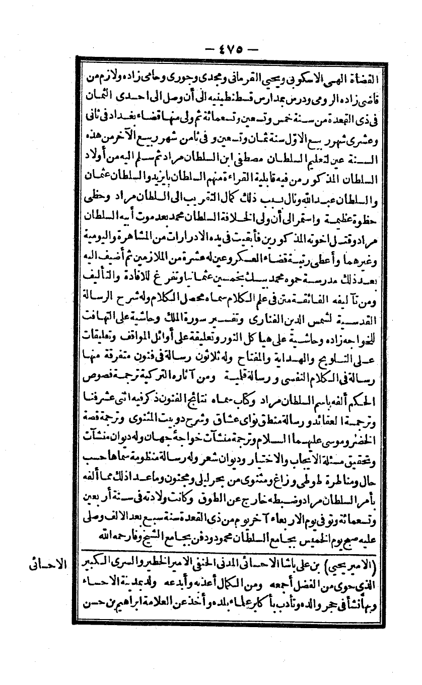 الامير يحيى بن على باشا الاحسائى المدنى الحنفى الامير الخطير والسرى الْكَبِير الذى حوى من الْفضل أجمعه وَمن الْكَمَال أعذبه وأبدعه ولد بِمَدِينَة الاحساء وَبهَا نَشأ فى حجر وَالِده وتأدب بأكابر عُلَمَاء بَلَده وَأخذ عَن الْعَلامَة ابراهيم بن حسن