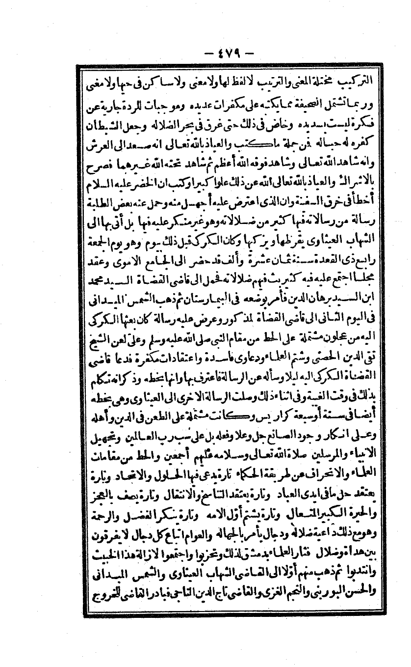 وعَلى لعن الشَّيْخ تقى الدّين الحصنى وَشتم الْعلمَاء ودعاوى فَاسِدَة واعتقادات مكفرة فَدَعَا قاضى الْقُضَاة الكركى اليه لَيْلًا وَسَأَلَهُ عَن الرسَالَة فاعترف بهَا وانها بِخَطِّهِ وَذكر انه تكلم بذلك فى وَقت الْغَيْبَة وفى اثناء ذَلِك وصلت الرسَالَة الاخرى الى العيثاوى وهى بِخَطِّهِ أَيْضا فى سنة أَو سَبْعَة كراريس وَكَانَت مُشْتَمِلَة على الطعْن فى الدّين وَأَهله وعَلى انكار وجود الصَّانِع جلّ وَعلا وَفعله بل على سبّ رب الْعَالمين وتجهيل الانبياء وَالْمُرْسلِينَ صَلَاة الله تَعَالَى وَسَلَامه عَلَيْهِم أَجْمَعِينَ والحط من مقامات الْعلمَاء والانحراف عَن طَريقَة الْحُكَمَاء تَارَة يدعى فِيهَا الْحُلُول والاتحاد وَتارَة يعْتَقد حل مَا فى ايدى الْعباد وَتارَة يعْتَقد التناسخ والانتقال وَتارَة يصف بِالْعَجزِ والحيرة الْكَبِير المتعال وَتارَة يشْتم أول الامه وَتارَة يُنكر الْفضل وَالرَّحْمَة وَهُوَ مَعَ ذَلِك دَاعِيَة ضلاله ودجال بِأَمْر بالجهاله والعوام اتِّبَاع كل دجال لَا يفرقون بَين هداة وضلال فثار الْعلمَاء بِدِمَشْق لذَلِك وتحزبوا واجتمعوا لازالة هَذَا الْخَبيث وانتدبوا ثمَّ ذهب مِنْهُم أَولا الى القاضى الشهَاب العيثاوى وَالشَّمْس الميدانى وَالْحسن البورينى والنجم الغزى والقاضى تَاج الدّين التاجى فبادر القاضى لِلْخُرُوجِ