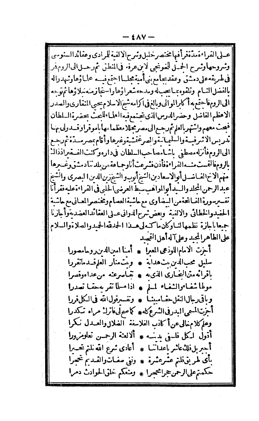 على الْقُرَّاء مُدَّة قَرَأَ فِيهَا مُخْتَصر خَلِيل وَشرح الالفية للمرادى وعقائد السنوسى وشروحها وَشرح الْجمل للخونجى لِابْنِ عرفه فى الْمنطق ثمَّ رَحل الى الرّوم فَمر فى طَرِيقه على دمشق وَعقد بِجَامِع بنى أُميَّة مَجْلِسا اجْتمع فِيهِ علماؤها وشهدوا لَهُ بِالْفَضْلِ التَّام وتلقوه بِمَا يجب لَهُ ومدحه شعراؤها واستجاز مِنْهُ نبلاؤها ثمَّ توجه الى الرّوم فَاجْتمع بِهِ أكَابِر الموالى وَبَالغ فى اكرامه شيخ الاسلام يحيى المنقارى والصدر الاعظم الْفَاضِل وَحضر الدَّرْس الذى تَجْتَمِع فِيهِ الْعلمَاء للبحث بِحَضْرَة السُّلْطَان فبحث مَعَهم واشتهر بِالْعلمِ ثمَّ رَجَعَ الى مصر مجللا مُعظما مهابا موقرا وَقد ولى بهَا تدريس الاشرفية والسليمانية والصرغتمشية وَغَيرهَا وَأقَام بِمصْر مُدَّة ثمَّ رَجَعَ الى الرّوم فأنزله مصطفى باشا وَصَاحب السُّلْطَان فِي دلره وَكنت الْفَقِير إِذْ ذك بالروم فَالْتمست مِنْهُ الْقِرَاءَة فَأذن فشرعت أَنا وَجَمَاعَة من بلد تنا دمشق وَغَيرهَا مِنْهُم الاخ الْفَاضِل أَبُو الاسعاد بن الشَّيْخ أَيُّوب وَالشَّيْخ زين الدّين البصرى وَالشَّيْخ عبد الرَّحْمَن المجلد وَالسَّيِّد أَبُو الْمَوَاهِب سبط العرضى الحلبى فى الْقِرَاءَة عَلَيْهِ فقرأنا تَفْسِير سُورَة الْفَاتِحَة من البيضاوى مَعَ حَاشِيَة العصام ومختصر الْمعَانى مَعَ حَاشِيَة الْحَفِيد والخطائى والالفية وَبَعض شرح الدوانى على العقائد العضدية وأجازنا جَمِيعًا باجازة نظمها لنا وَكَانَ مَا كتبه لى هَذَا الْحَمد لله الحميد وَالصَّلَاة وَالسَّلَام على الطَّاهِر الْمجِيد وعَلى آله أهل التمجيد