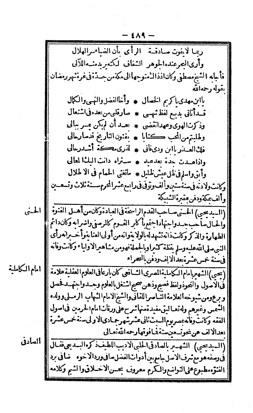 يحيى الشهير بامام الكاملية المصرى الشافعى كَانَ بارعا فى الْعُلُوم الْعَقْلِيَّة عَلامَة فى الاصول والنحوذ وَلَفظ فصيح وذهن صَحِيح اشْتغل بالعلوم وجد واجتهد فَحصل وبرع وَمن شُيُوخه الْعَلامَة النَّاصِر اللقانى وَالشَّيْخ الامام الشهَاب الرملى وَولده الشَّمْس وَغَيرهم وَله تعاليق مفيدة مِنْهَا شرح على وَرَقَات امام الْحَرَمَيْنِ فى اصول الْفِقْه وَكَانَت وَفَاته بِمصْر يَوْم السبت ثانى عشر شهر جُمَادَى الاولى سنة خمس عشرَة بعد الالف عَن نَحْو تسعين سنة فَمَا فَوْقهَا رَحمَه الله تَعَالَى