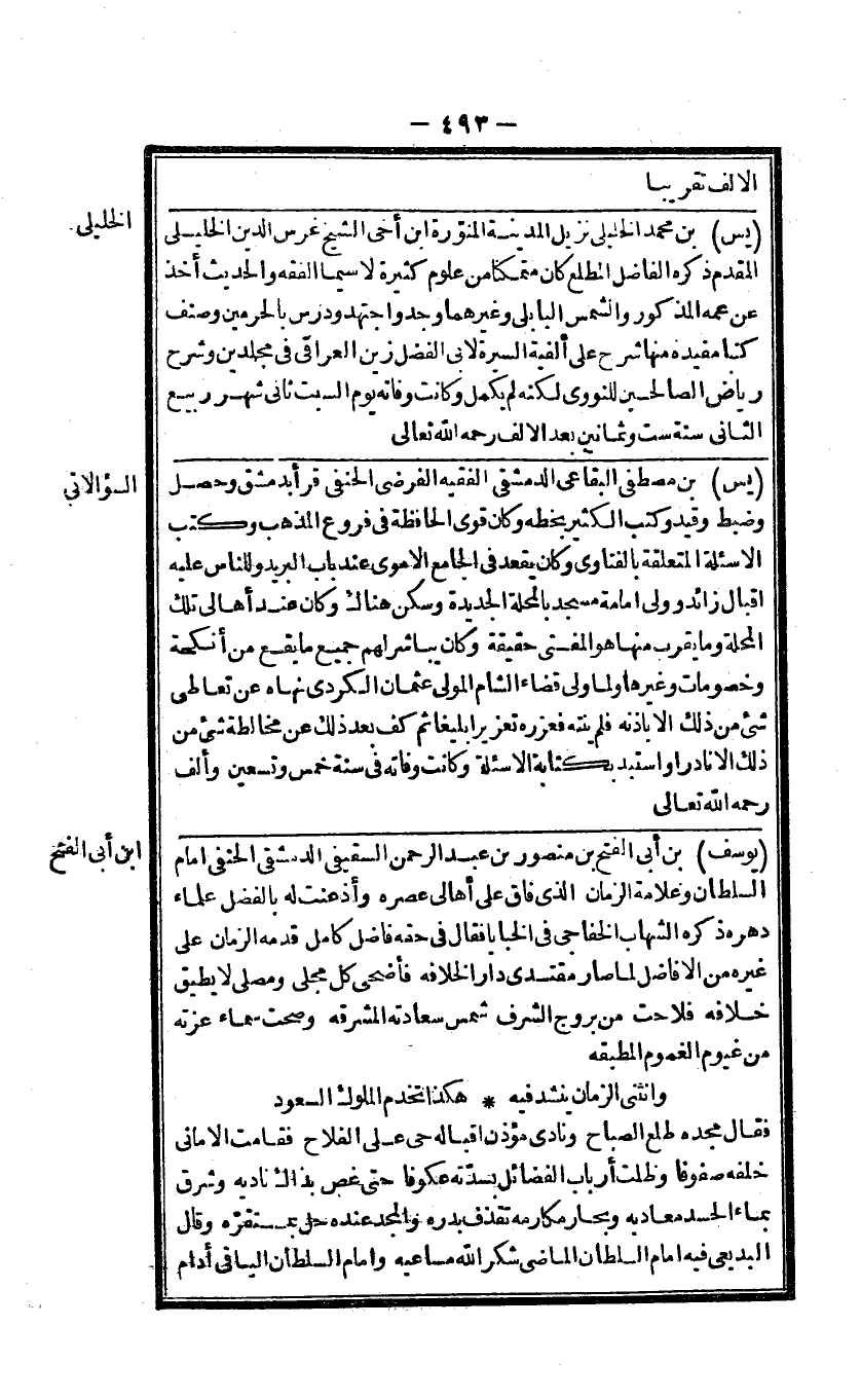 يس بن مصطفى البقاعى الدمشقى الْفَقِيه الفرضى الحنفى قَرَأَ بِدِمَشْق وَحصل وَضبط وَقيد وَكتب الْكثير بِخَطِّهِ وَكَانَ قوى الحافظة فى فروع الْمَذْهَب وَكتب الاسئلة الْمُتَعَلّقَة بالفتاوى وَكَانَ يقْعد فى الْجَامِع الاموى عِنْد بَاب الْبَرِيد وَلِلنَّاسِ عَلَيْهِ اقبال زَاد وَولى امامة مَسْجِد بالمحلة الجديدة وَسكن هُنَاكَ وَكَانَ عِنْد أهالى تِلْكَ الْمحلة وَمَا يقرب مِنْهَا هُوَ الْمُفْتى حَقِيقَة وَكَانَ يُبَاشر لَهُم جَمِيع مَا يَقع من أنكحة وخصومات وَغَيرهَا وَلما ولى قَضَاء الشَّام الْمولى عُثْمَان الكردى نَهَاهُ عَن تعاطى شئ من ذَلِك الا باذنه فَلم ينْتَه فعزره تعزيرا بليغا ثمَّ كف بعد ذَلِك عَن مُخَالطَة شئ من ذَلِك الا نَادرا واستبد بِكِتَابَة الاسئلة وَكَانَت وَفَاته فى سنة خمس وَتِسْعين وَألف رَحمَه الله تَعَالَى