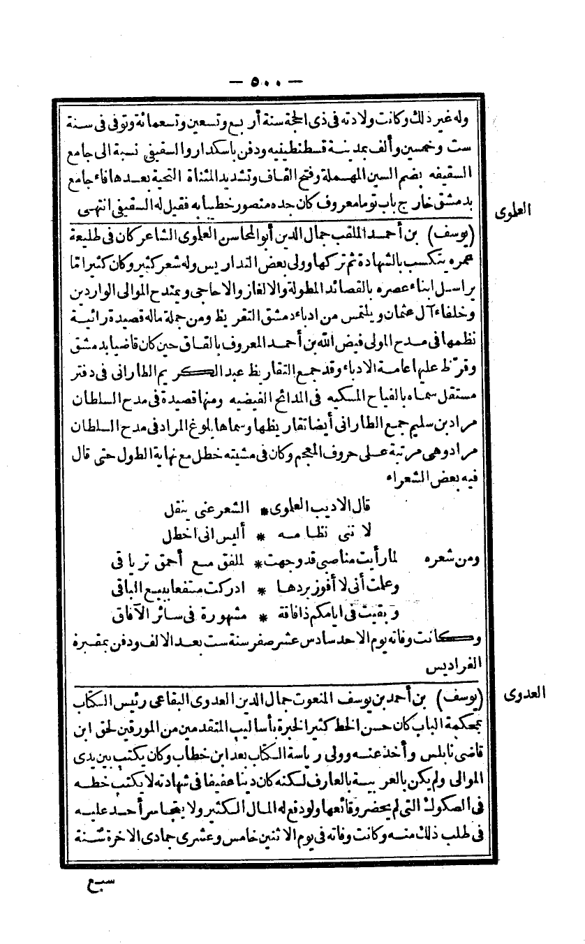يُوسُف بن أَحْمد بن يُوسُف المنعوت جمال الدّين الْعَدْوى البقاعى رَئِيس الْكتاب بمحكمة الْبَاب كَانَ حسن الْخط كَثِيرَة الْخِبْرَة بأساليب المتقدميين لحق ابْن قاضى نابلس وَأخذ عَنهُ وَولى رياسة الْكتاب بعد ابْن خطاب وَكَانَ يكْتب بَين يدى الموالى وَلم يكن بِالْعَرَبِيَّةِ بالعارف لكنه كَانَ دينا عفيفا فى شَهَادَته لَا يكْتب خطه فى الصكوك الَّتِى لم يحضر وقائعها وَلَو دفع لَهُ المَال الْكثير وَلَا يتجاسر أحد عَلَيْهِ فى طلب ذَلِك مِنْهُ وَكَانَت وَفَاته فى يَوْم الِاثْنَيْنِ خَامِس وعشرى جُمَادَى الاخرة سنة
