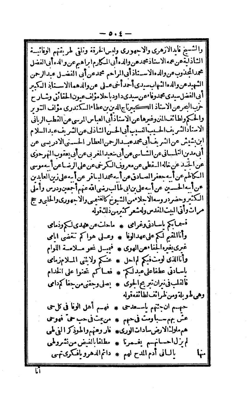 وَالشَّيْخ فَايِد الازهرى والاجهورى وَلبس الْخِرْقَة وتلقى طريقتهم الوفائية الشاذلية عَن عَمه الاستاذ مُحَمَّد عَن وَالِده أَبى المكارم ابراهيم عَن وَالِده أَبى الْفضل مُحَمَّد المجذوب عَن وَالِده الاستاذ أَبى المراحم مُحَمَّد عَن أَبى الْفضل عبد الرَّحْمَن الشَّهِيد عَن وَالِده الشهَاب سيدى أَحْمد أخى على عَن والدهما الاستاذ الْكَبِير أَبى الْفضل سيدى مُحَمَّد وَفَاء عَن سيدى دَاوُد باحلا مؤلف عُيُون الْحَقَائِق وشارح حزب الْبَحْر عَن الاستاذ الْكَبِير تَاج الدّين بن عَطاء السكندرى مؤلف التَّنْوِير وَالْحكم ولطائف المنن وَغَيرهَا عَن الاستاذ أَبى الْعَبَّاس المرسى عَن القطب الربانى الاستاذ الشريف الحسيب النسيب أَبى الْحسن الشاذلى عَن الشريف عبد السَّلَام ابْن بشيش عَن الشريف أَبى مُحَمَّد عبد الرَّحْمَن الْعَطَّار الْحسنى الادريسى عَن أَبى مَدين التلمسانى عَن الشاشى عَن أَبى سعيد المغربى عَن أَبى يَعْقُوب النهرحوى عَن الْجُنَيْد عَن خَاله السقطى عَن مَعْرُوف الكرخى عَن على الرِّضَا عَن أَبِيه مُوسَى الكاظم عَن أَبِيه جَعْفَر الصَّادِق عَن أَبِيه مُحَمَّد الباقر عَن أَبِيه على زين العابدين عَن أَبِيه الْحُسَيْن عَن أَبِيه على بن ابى طَالب رضى الله عَنْهُم أَجْمَعِينَ ودرس وأملى الْكثير وَحضر دروسه الاجلاء من الشُّيُوخ كالغنيمى والاجهورى والحلبى وَحج مَرَّات وأتى الْبَيْت الْمُقَدّس وَله شعر كثير من ذَلِك قَوْله