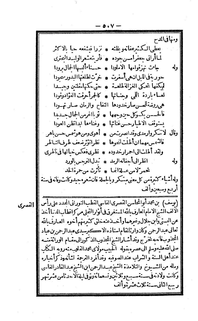 يُوسُف بن مُحَمَّد أَبُو المحاسن الْقصرى الفاسى القطب النورانى المجدد على رَأس الالف الشَّيْخ الامام الْعَارِف بِاللَّه الْمُسْتَغْرق فى أنوار التجلى مَرْكَز أقطاب الدُّنْيَا أَخذ عَن البستى وَابْن جلال وَغَيرهمَا وَأخذ عَنهُ خلق كثير مِنْهُم أَخُوهُ الْعَارِف بِاللَّه تَعَالَى عبد الرَّحْمَن وَكَانَ وَارِثا لمقام استاذه الاكبر سيدى عبد الرَّحْمَن بن عباد المجذوب فانه بِهِ تخرج وَقد أَشَارَ الشَّيْخ المجذوب الْمَذْكُور الى مقَام الوراثة مِنْهُ