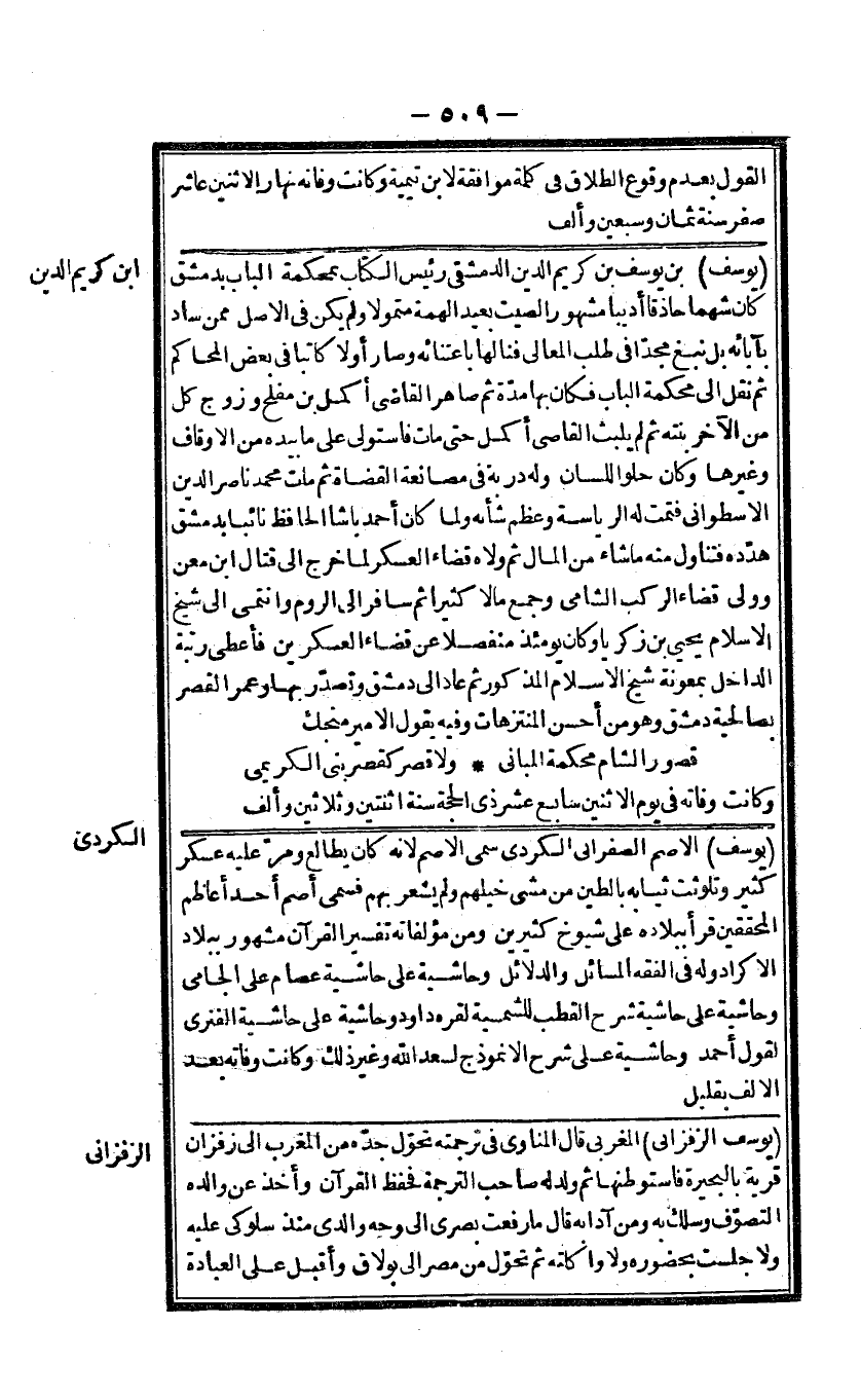 يُوسُف بن يُوسُف بن كريم الدّين الدمشقى رَئِيس الْكتاب بمحكمة الْبَاب بِدِمَشْق كَانَ شهما حاذقا أديبا مَشْهُور الصيت بعيد الهمة متمولا وَلم يكن فى الاصل مِمَّن سَاد بآبائه بل نبغ مجدا فى طلب المعالى فنالها باعتنائه وَصَارَ أَولا كَاتبا فى بعض المحاكم ثمَّ نقل الى محكمَة الْبَاب فَكَانَ بهَا مُدَّة ثمَّ صاهر القاضى أكمل بن مُفْلِح وَزوج كل من الآخر بنته ثمَّ لم يلبث القاضى أكمل حَتَّى مَاتَ فاستولى على مَا بِيَدِهِ من الاوقاف وَغَيرهَا وَكَانَ حُلْو اللِّسَان وَله دربة فى مصانعة الْقُضَاة ثمَّ مَاتَ مُحَمَّد نَاصِر الدّين الاسطوانى فتمت لَهُ الرياسة وَعظم شَأْنه وَلما كَانَ أَحْمد باشا الْحَافِظ نَائِبا بِدِمَشْق هدده فَتَنَاول مِنْهُ مَا شَاءَ من المَال ثمَّ ولاه قَضَاء الْعَسْكَر لما خرج الى قتال ابْن معن وَولى قَضَاء الركب الشامى وَجمع مَالا كثيرا ثمَّ سَافر الى الرّوم وانتمى الى شيخ الاسلام يحيى بن زَكَرِيَّا وَكَانَ يَوْمئِذٍ مُنْفَصِلا عَن قَضَاء العسكرين فَأعْطى رُتْبَة الدَّاخِل بمعونة شيخ الاسلام الْمَذْكُور ثمَّ عَاد الى دمشق وتصدر بهَا وَعمر الْقصر بصالحية دمشق وَهُوَ من أحسن المنتزهات وَفِيه يَقُول الامير منجك