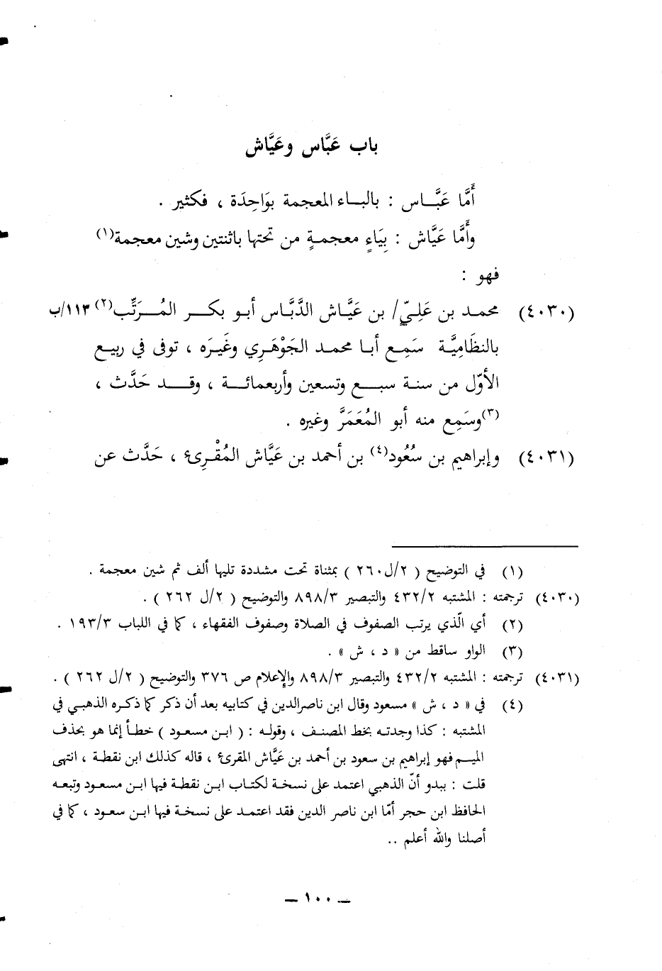 4030 - مُحَمَّد بن عَليّ بن عَيَّاش الدباس أَبُو بكر الْمُرَتّب بالنظامية سمع أَبَا مُحَمَّد الْجَوْهَرِي وَغَيره توفّي فِي ربيع الأول من سنة سبع وَتِسْعين واربعمائة وَقد حدث وَسمع مِنْهُ ابو المعمر وَغَيره