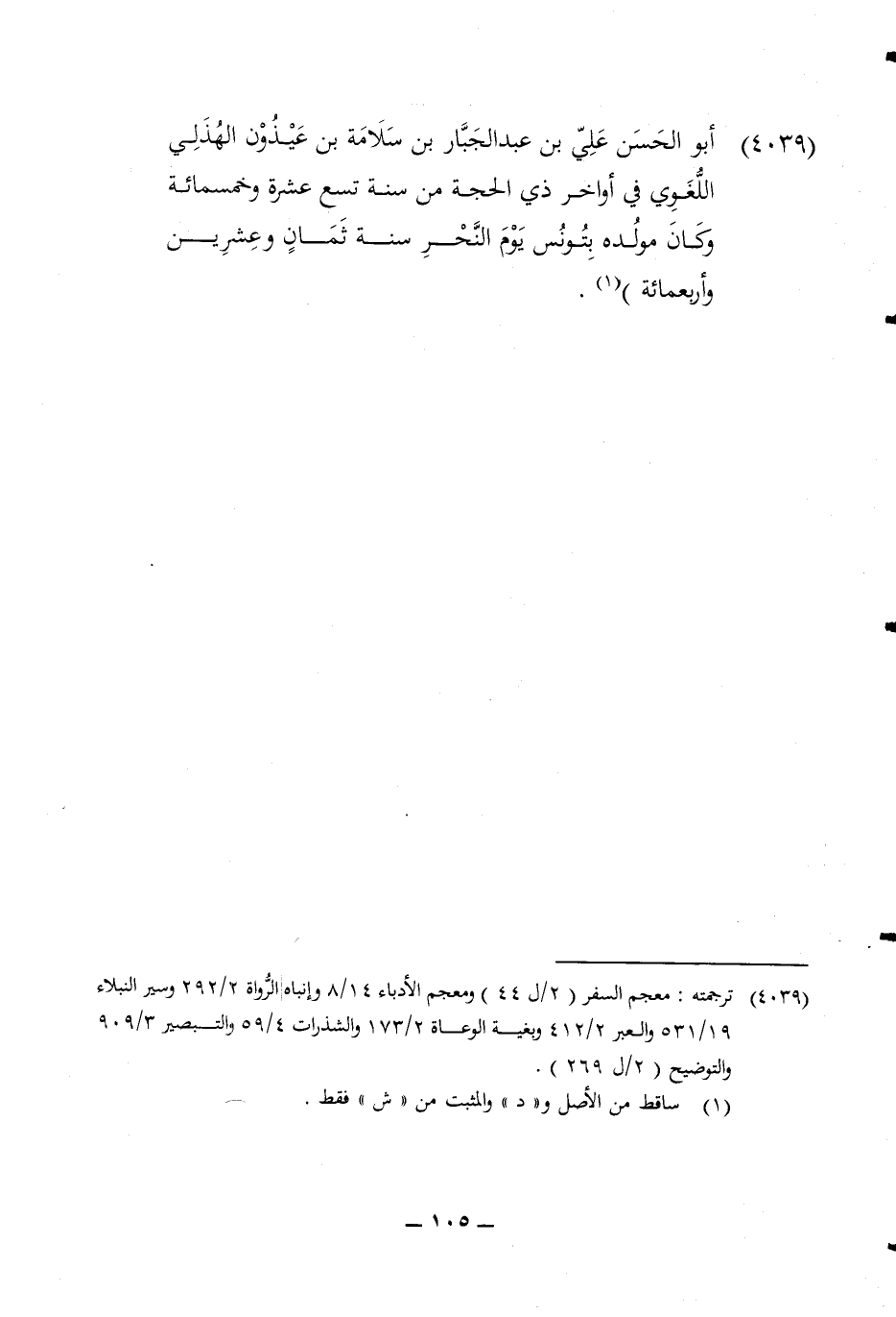 4039 - أَبُو الْحسن عَليّ بن عبد الْجَبَّار بن سَلامَة بن عيذون الْهُذلِيّ اللّغَوِيّ فِي أَوَاخِر ذِي الْحجَّة من سنة تسع عشرَة وَخَمْسمِائة وَكَانَ مولده بتونس يَوْم النَّحْر سنة ثَمَان وَعشْرين واربعمائة