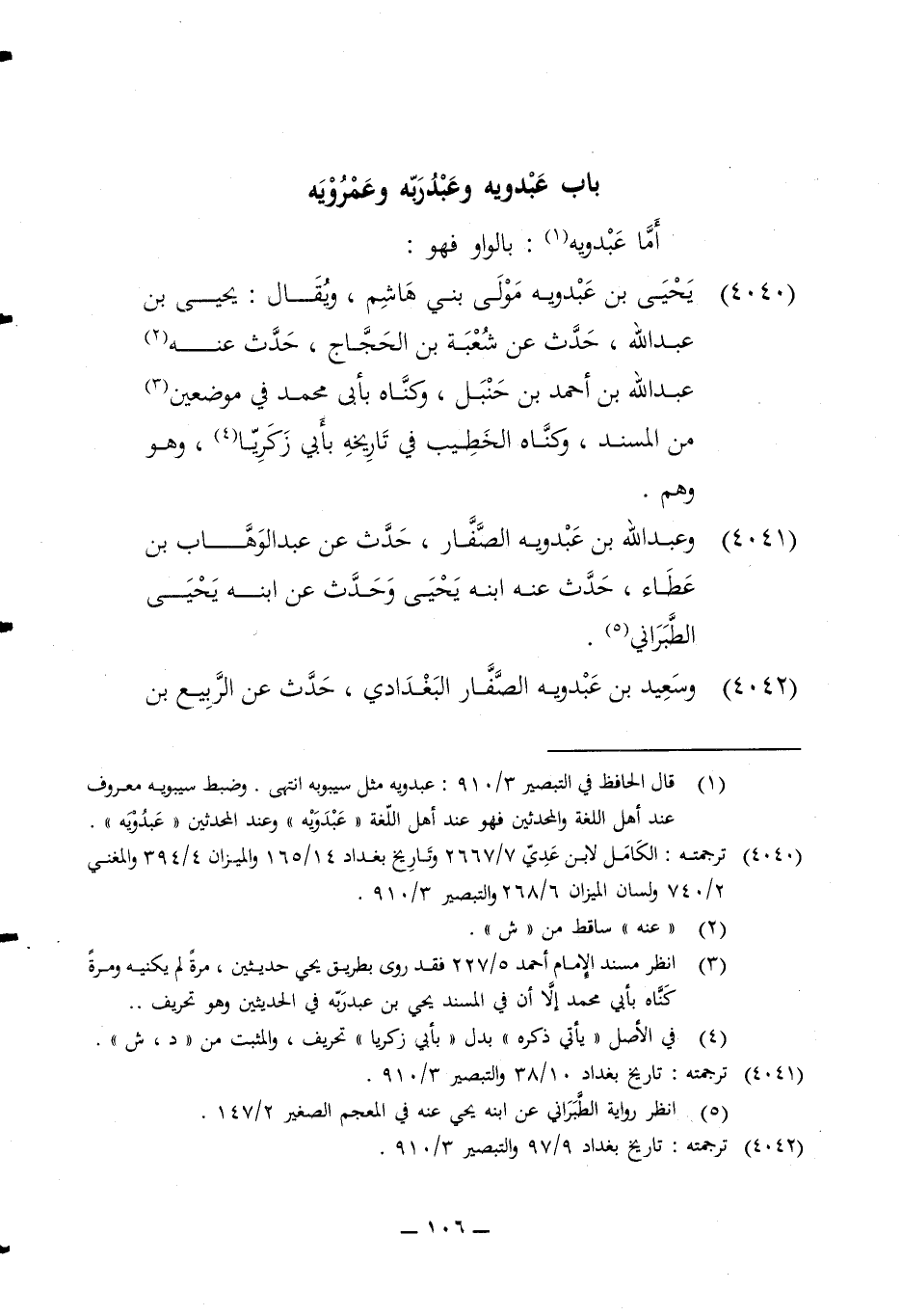 4040 - يحيى بن عبدويه مولى بني هَاشم وَيُقَال يحيى بن عبد الله حدث عَن شُعْبَة بن الْحجَّاج حدث عَنهُ عبد الله بن أَحْمد بن حَنْبَل وكناه بِأبي مُحَمَّد فِي موضِعين من الْمسند وكناه الْخَطِيب فِي تَارِيخه بِأبي زَكَرِيَّا وَهُوَ وهم