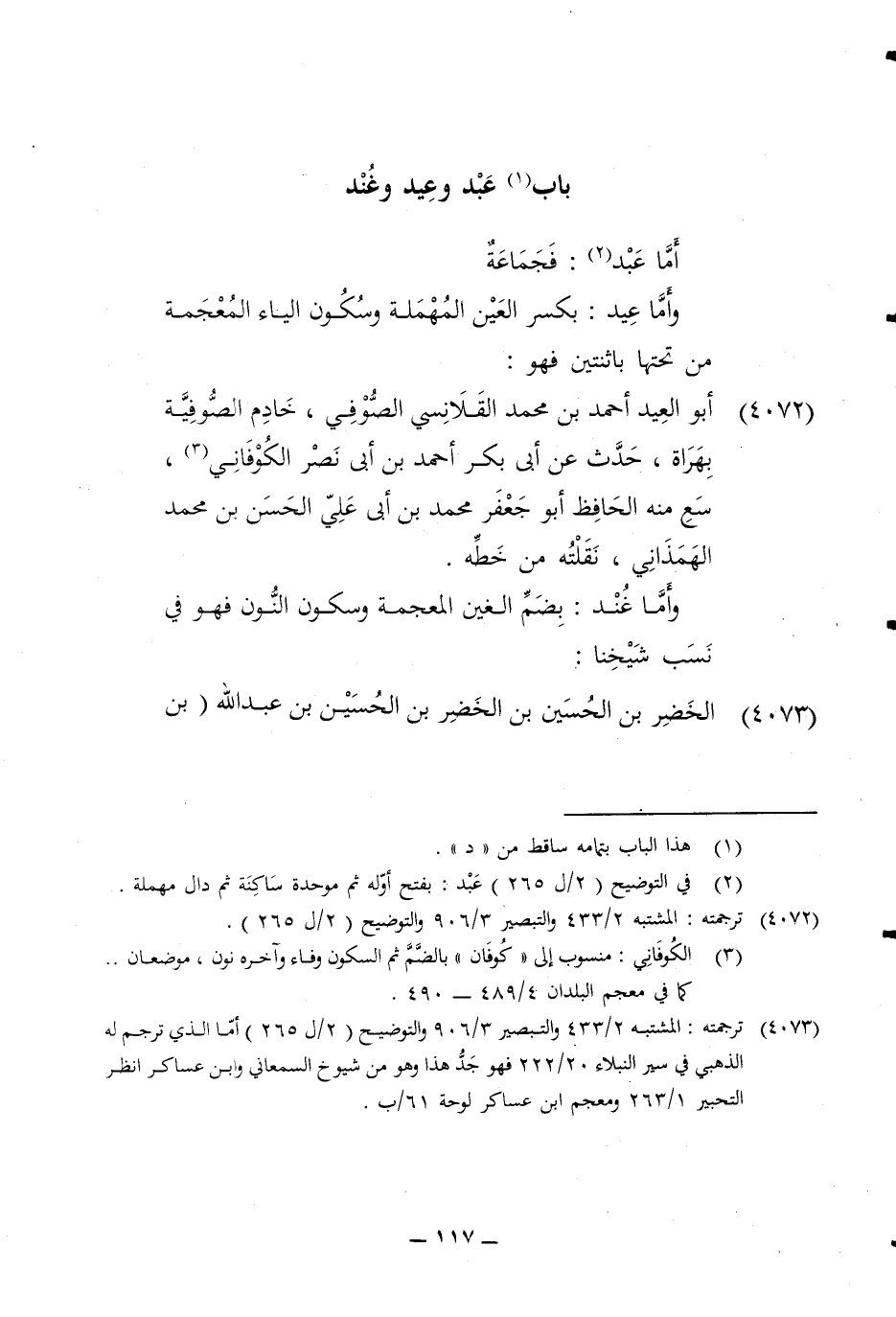 4072 - أَبُو الْعِيد أَحْمد بن مُحَمَّد القلانسي الصُّوفِي خَادِم الصُّوفِيَّة بهراة حدث عَن ابي بكر أَحْمد بن أبي نصر الكوفاني سع مِنْهُ الْحَافِظ أَبُو جَعْفَر مُحَمَّد بن أبي عَليّ الْحسن بن مُحَمَّد الهمذاني نقلته من خطه