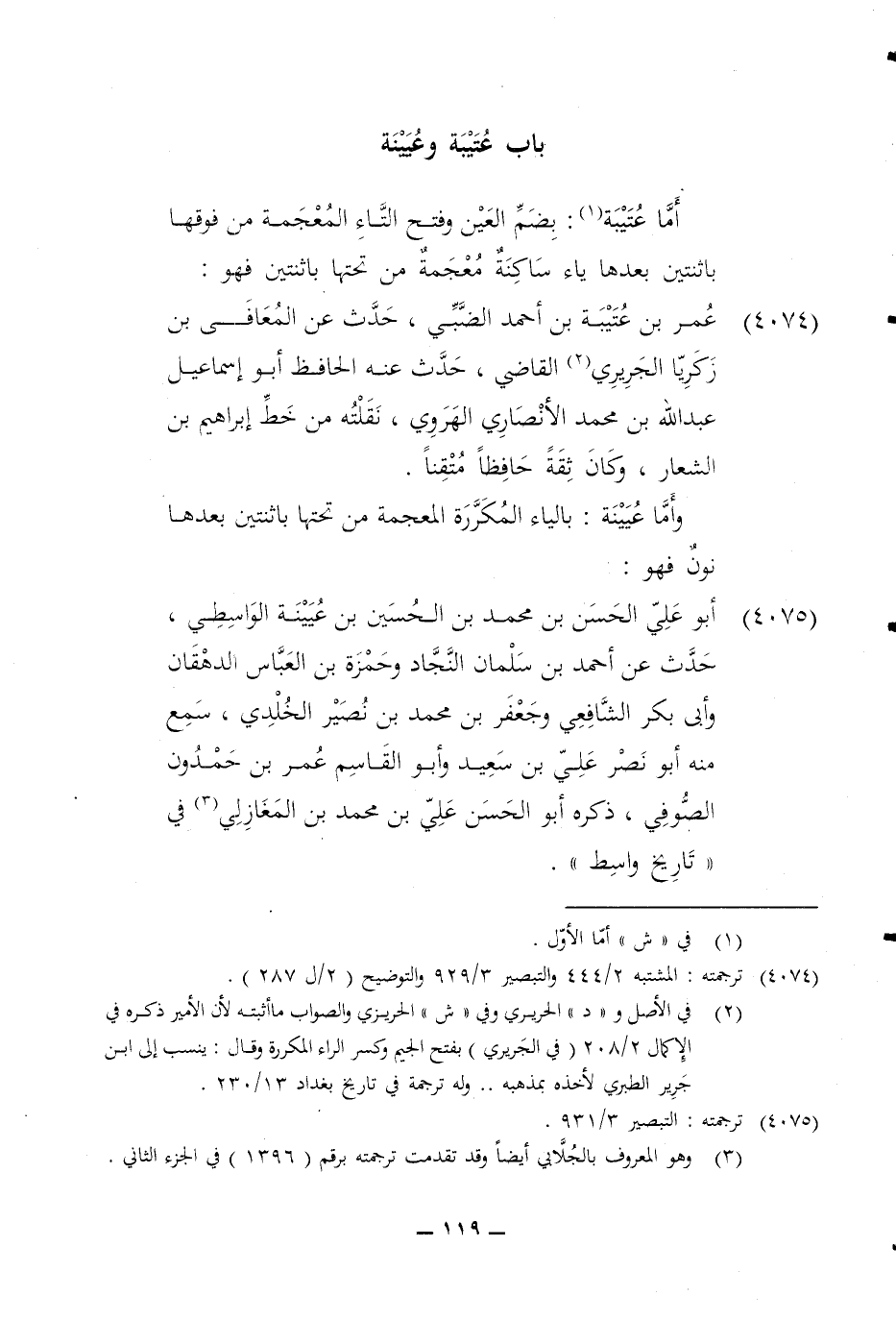 4074 - عمر بن عتيبة بن أَحْمد الضَّبِّيّ حدث عَن الْمعَافى بن زَكَرِيَّا الْجريرِي القَاضِي حدث عَنهُ الْحَافِظ أَبُو إِسْمَاعِيل عبد الله بن مُحَمَّد الْأنْصَارِيّ الْهَرَوِيّ نقلته من خطّ إِبْرَاهِيم بن الشعار وَكَانَ ثِقَة حَافِظًا متقنا