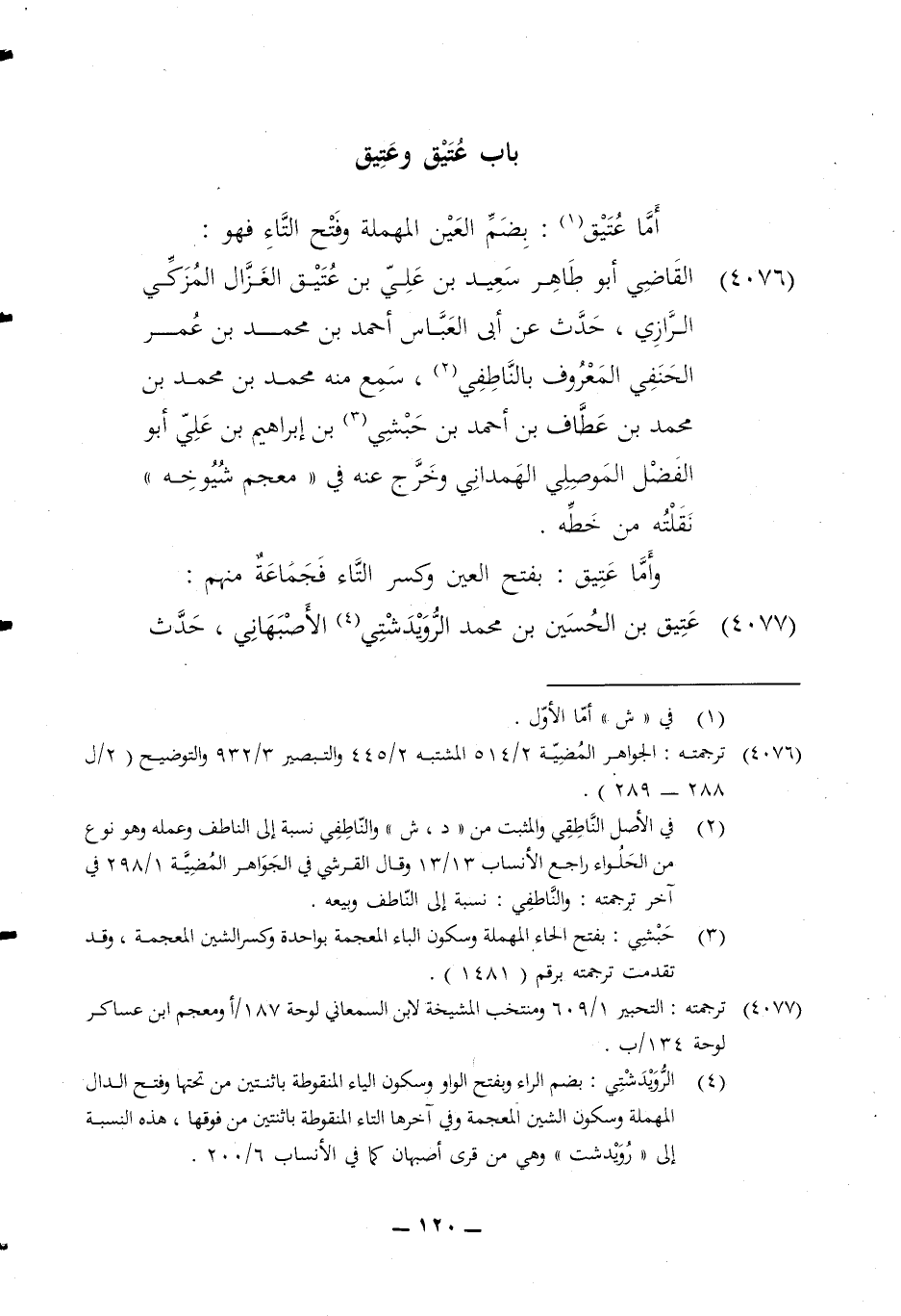 4077 - عَتيق بن الْحُسَيْن بن مُحَمَّد الرويدشتي الْأَصْبَهَانِيّ حدث عَن سعيد بن أبي سعيد الْعيار حَدثنَا عَنهُ غير وَاحِد باصبهان كنيته أَبُو بكر توفّي بأصبهان فِيمَا قَالَ معمر بن عبد الْوَاحِد بن الفاخر فِي يَوْم عَرَفَة من سنة اربعين وَخَمْسمِائة