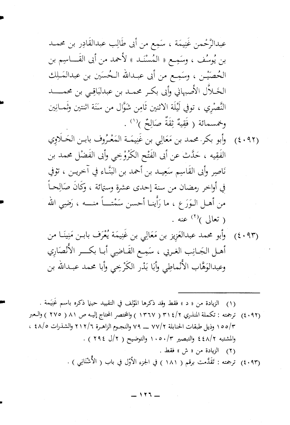 4092 - وَأَبُو بكر مُحَمَّد بن معالي بن غنيمَة الْمَعْرُوف بِابْن الحلاوي الْفَقِيه حدث عَن أبي الْفَتْح الكروخي وابي الْفضل مُحَمَّد بن نَاصِر وَأبي الْقَاسِم سعيد بن أَحْمد بن الْبناء فِي آخَرين توفّي فِي أَوَاخِر رَمَضَان من سنة إِحْدَى عشرَة وسِتمِائَة وَكَانَ صَالحا من أهل الْوَرع مَا رَأينَا أحسن سمتا مِنْهُ رَضِي الله تَعَالَى عَنهُ