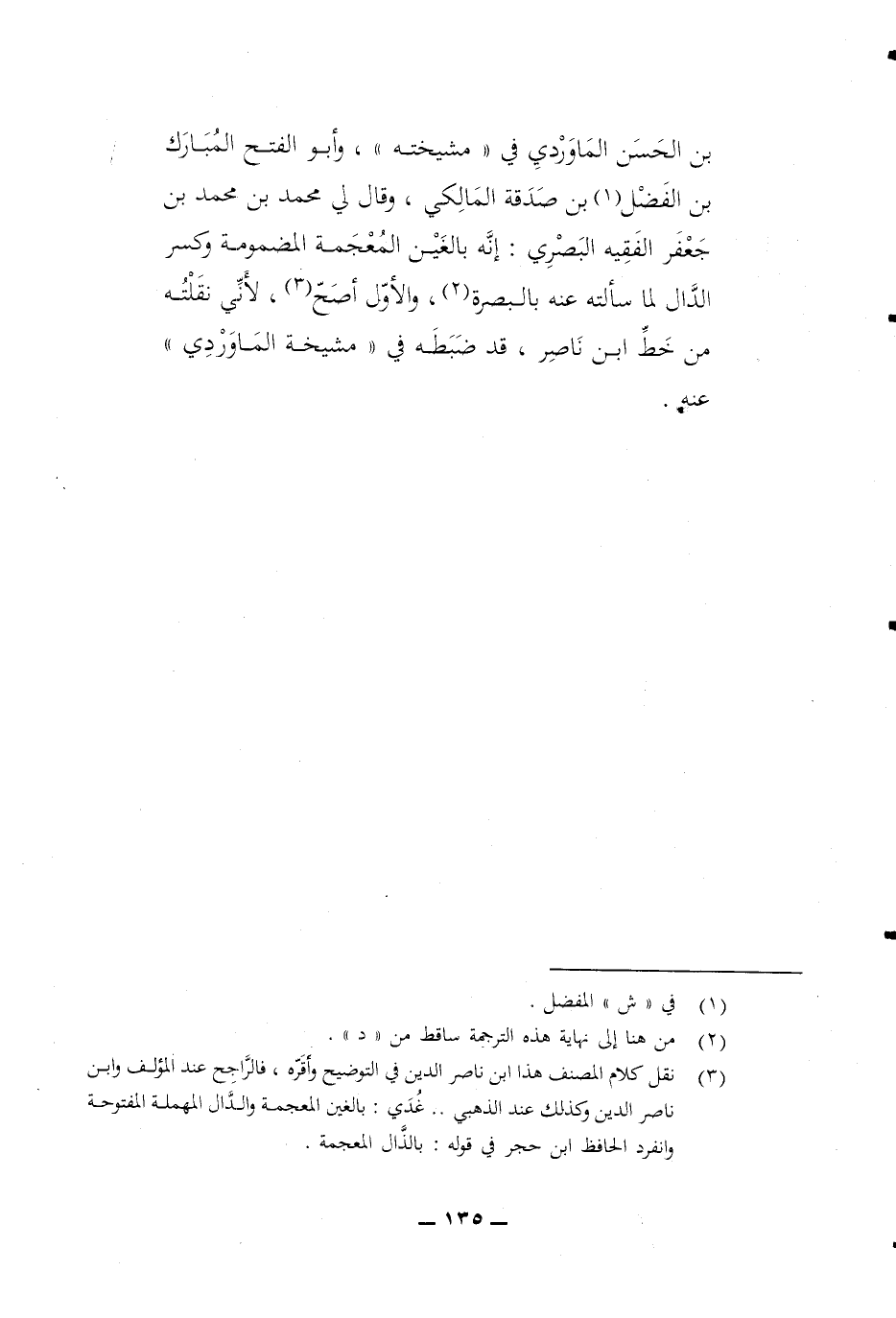 بن الْحسن الْمَاوَرْدِيّ فِي مشيخته وَأَبُو الْفَتْح الْمُبَارك بن الْفضل بن صَدَقَة الْمَالِكِي وَقَالَ لي مُحَمَّد بن مُحَمَّد بن جَعْفَر الْفَقِيه الْبَصْرِيّ إِنَّه بالغين الْمُعْجَمَة المضمومة وَكسر الدَّال لما سَأَلته عَنهُ بِالْبَصْرَةِ وَالْأول أصح لِأَنِّي نقلته من خطّ ابْن نَاصِر قد ضَبطه فِي مشيخة الْمَاوَرْدِيّ عَنهُ