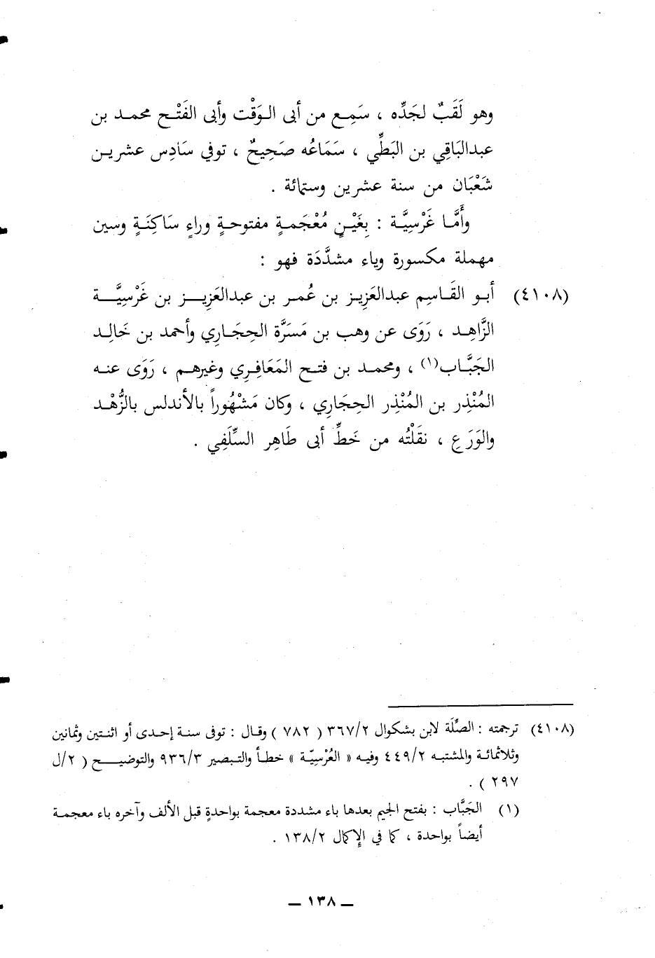 4108 - أَبُو الْقَاسِم عبد الْعَزِيز بن عمر بن عبد الْعَزِيز بن غرسية الزَّاهِد روى عَن وهب بن مَسَرَّة الحجاري وَأحمد بن خَالِد الْجبَاب وَمُحَمّد بن فتح الْمعَافِرِي وَغَيرهم روى عَنهُ الْمُنْذر بن الْمُنْذر الحجاري وَكَانَ مَشْهُورا بالأندلس بالزهد والورع نقلته من خطّ أبي طَاهِر السلَفِي