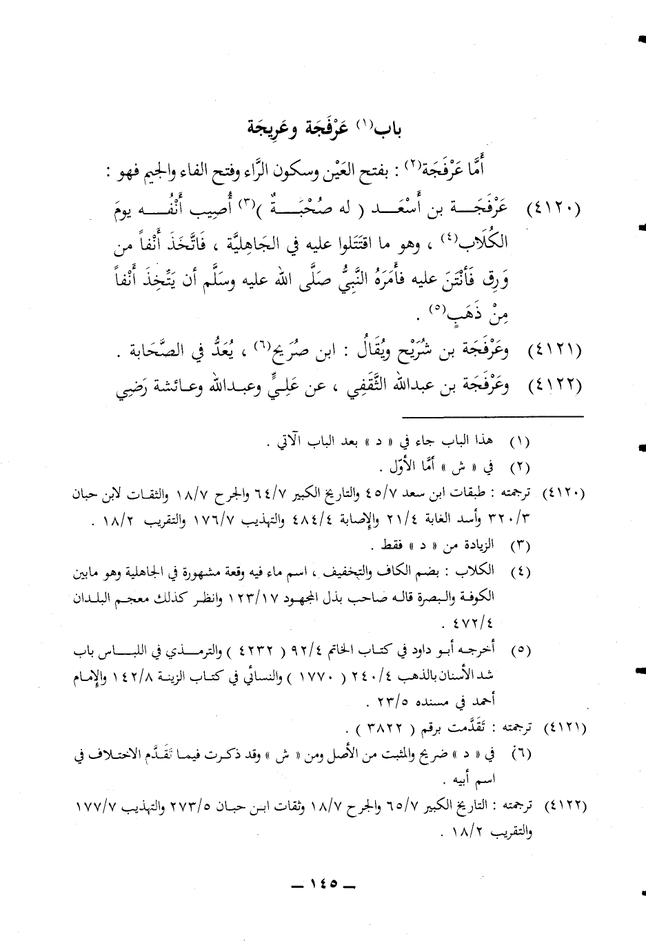 4120 - عرْفجَة بن أسعد لَهُ صُحْبَة أُصِيب أَنفه يَوْم الْكلاب وَهُوَ مَا اقْتَتَلُوا عَلَيْهِ فِي الْجَاهِلِيَّة فَاتخذ أنفًا من ورق فَأَنْتن عَلَيْهِ فَأمره النَّبِي صلى الله عَلَيْهِ وَسلم أَن يتَّخذ أنفًا من ذهب