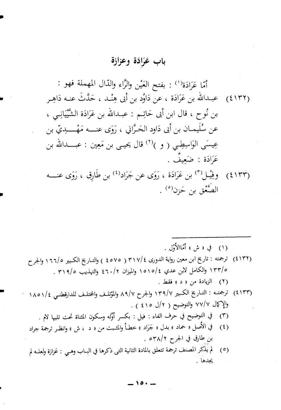 4132 - عبد الله بن عَرَادَة عَن دَاوُد بن أبي هِنْد حدث عَنهُ داهر بن نوح قَالَ ابْن أَبى حَاتِم عبد الله بن عَرَادَة الشيياني عَن سُلَيْمَان بن أبي دَاوُد الْحَرَّانِي روى عَنهُ مهْدي بن عِيسَى الوَاسِطِيّ وَقَالَ يحيى بن معِين عبد الله بن عَرَادَة ضَعِيف