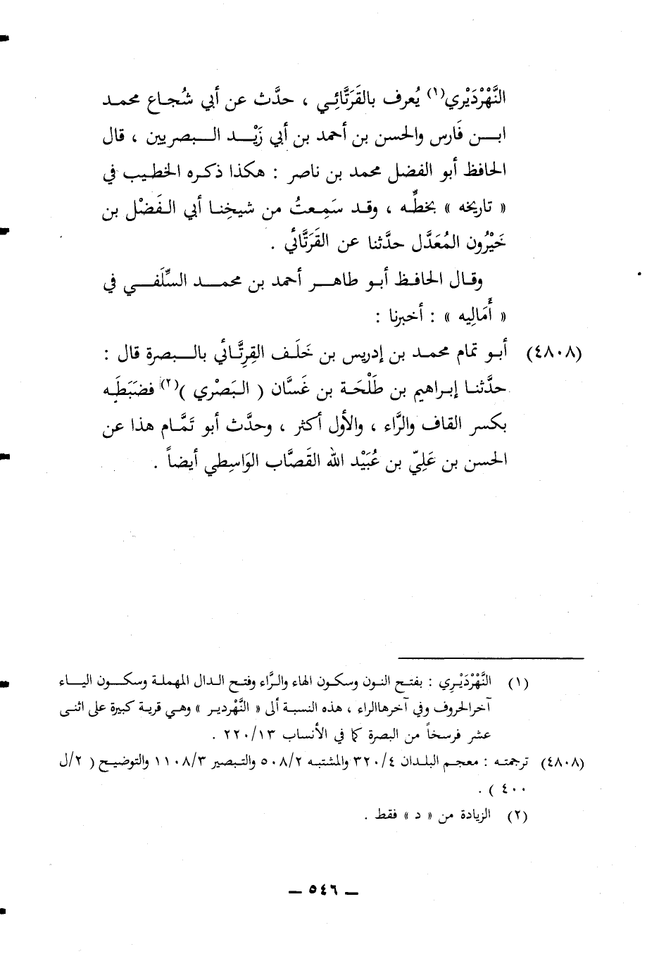 4808 - أَبُو تَمام مُحَمَّد بن إِدْرِيس بن خلف القرتائي بِالْبَصْرَةِ قَالَ حَدثنَا إِبْرَاهِيم بن طَلْحَة بن غَسَّان الْبَصْرِيّ فضبطه بِكَسْر الْقَاف وَالرَّاء وَالْأول أَكثر وَحدث أَبُو تَمام هَذَا عَن الْحسن بن عَليّ بن عبيد الله القصاب الوَاسِطِيّ ايضا