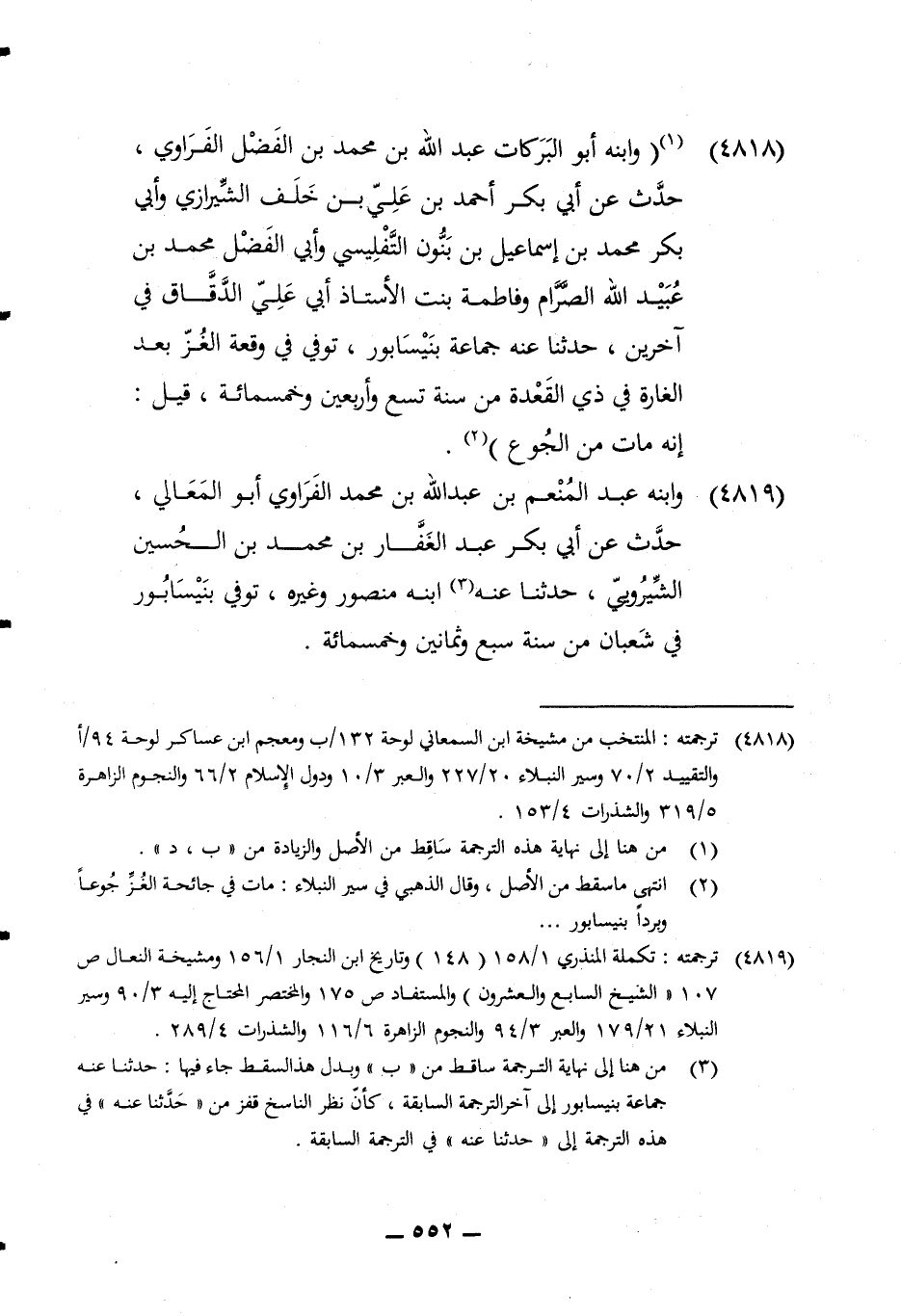 4818 - وَابْنه أَبُو البركات عبد الله بن مُحَمَّد بن الْفضل الفراوي حدث عَن أبي بكر أَحْمد بن عَليّ بن خلف الشِّيرَازِيّ وَأبي بكر مُحَمَّد بن إِسْمَاعِيل بن بنُون التفليسي وَأبي الْفضل مُحَمَّد بن عبيد الله الصرام وَفَاطِمَة بنت الْأُسْتَاذ أبي عَليّ الدقاق فِي آخَرين حَدثنَا عَنهُ جمَاعَة بنيسابور توفّي فِي وقْعَة الغز بعد الْغَارة فِي ذِي الْقعدَة من سنة تسع واربعين وَخَمْسمِائة قيل إِنَّه مَاتَ من الْجُوع