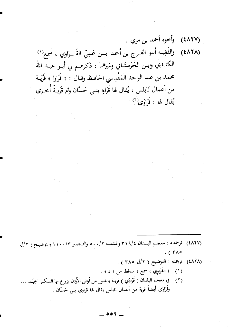 4828 - والفقيه أَبُو الْفرج بن أَحْمد بن عَليّ القراوي سمع الْكِنْدِيّ وَابْن الحرستاني وَغَيرهمَا ذكرهم لي أَبُو عبد الله مُحَمَّد بن عبد الْوَاحِد الْمَقْدِسِي الْحَافِظ وَقَالَ قراوا قَرْيَة من أَعمال نابلس يُقَال لَهَا قراوا بني حسان وَثمّ قَرْيَة أُخْرَى يُقَال لَهَا قراوى
