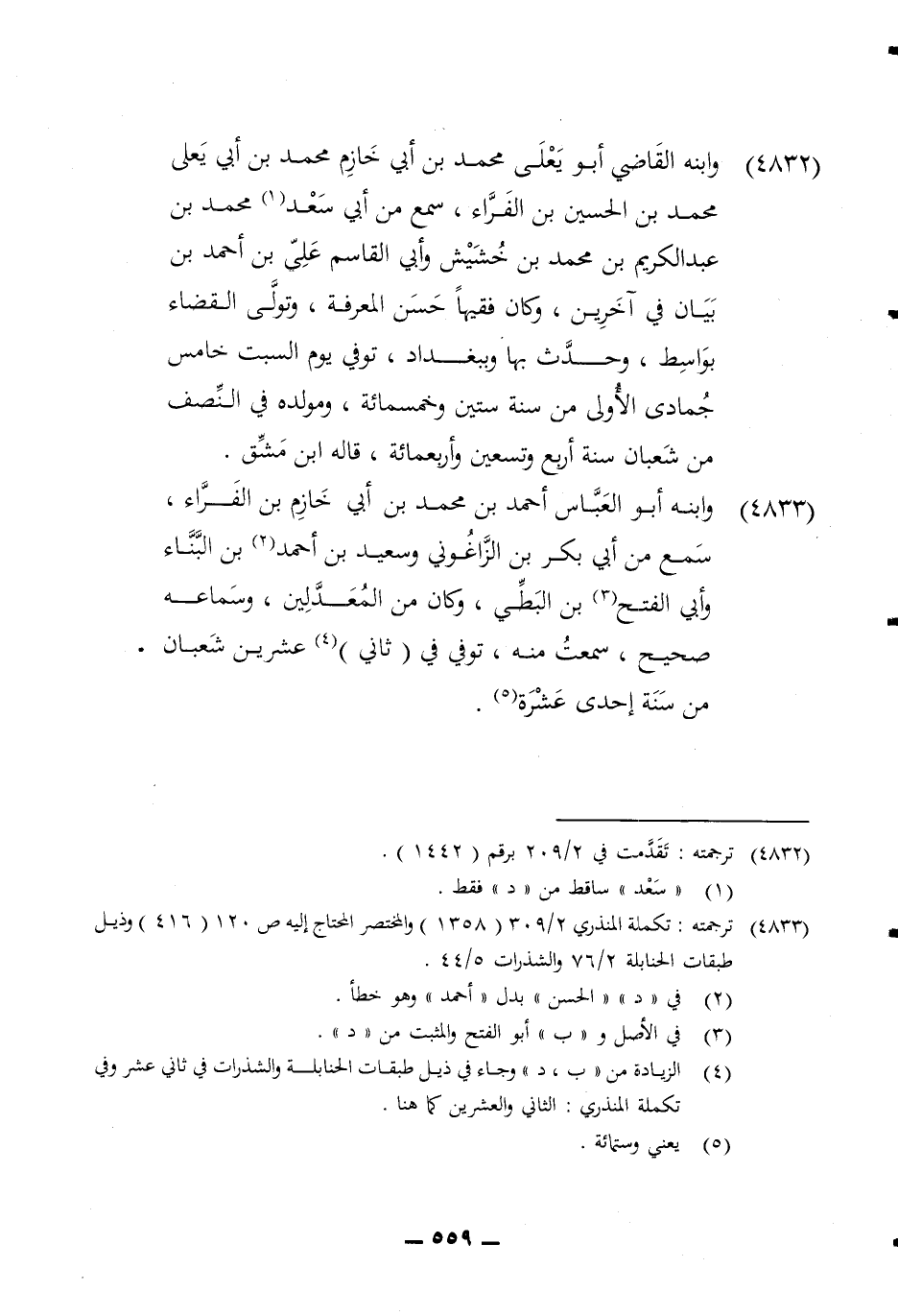 4833 - وَابْنه ابو الْعَبَّاس أَحْمد بن مُحَمَّد بن ابي خازم بن الْفراء سمع من أبي بكر بن الزَّاغُونِيّ وَسَعِيد بن أَحْمد بن الْبناء وَأبي الْفَتْح بن البطي وَكَانَ من المعدلين وسماعه صَحِيح سَمِعت مِنْهُ توفّي فِي ثَانِي عشْرين شعْبَان من سنة إِحْدَى عشرَة