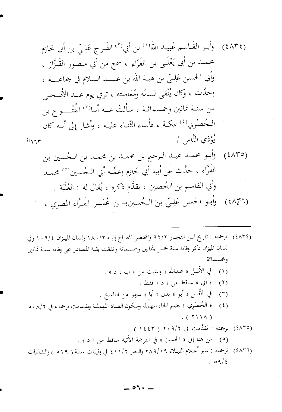 4834 - وَأَبُو الْقَاسِم عبيد الله بن أبي الْفرج عَليّ بن ابي حَازِم مُحَمَّد بن أبي يعلى بن الْفراء سمع من أبي مَنْصُور الْقَزاز وابي الْحسن عَليّ بن هبة الله بن عبد السَّلَام فِي جمَاعَة وَحدث وَكَانَ يتقى لِسَانه ومعاملته توفّي يَوْم عيد الْأَضْحَى من سنة ثَمَانِينَ وَخَمْسمِائة سَأَلت عَنهُ أَبَا الْفتُوح بن الحصري بِمَكَّة فأساء الثَّنَاء عَلَيْهِ واشار إِلَى أَنه كَانَ يُؤْذِي النَّاس