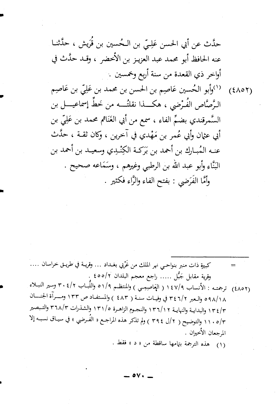 4852 - وَأَبُو الْحُسَيْن عَاصِم بن الْحسن بن مُحَمَّد بن عَليّ بن عَاصِم الرصاص الفرضي هَكَذَا نقلته من خطّ إِسْمَاعِيل بن السَّمرقَنْدِي بِضَم الْفَاء سمع من أبي الْغَنَائِم مُحَمَّد بن عَليّ بن أبي عُثْمَان وَأبي عمر بن مهْدي فِي آخَرين وَكَانَ ثِقَة حدث عَنهُ الْمُبَارك بن أَحْمد بن بركَة الْكِنْدِيّ وَسَعِيد بن أَحْمد بن الْبناء وَأَبُو عبد الله بن الرطبي وَغَيرهم وسماعه صَحِيح
