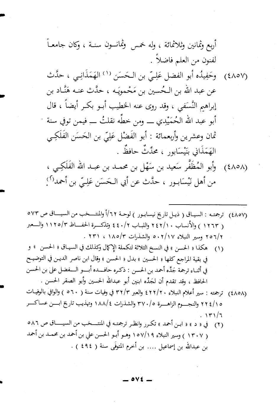 4857 - وحفيده أَبُو الْفضل عَليّ بن الْحسن الهمذاني حدث عَن عبد الله بن الْحُسَيْن بن محمويه حدث عَنهُ هناد بن إِبْرَاهِيم النَّسَفِيّ وَقد روى عَنهُ الْخَطِيب أَبُو بكر أَيْضا قَالَ أَبُو عبد الله الْحميدِي وَمن خطه نقلت فِيمَن توفّي سنة ثَمَان وَعشْرين واربعمائة أَبُو الْفضل عَليّ بن الْحسن الفلكي الهمذاني بنيسابور مُحدث حَافظ