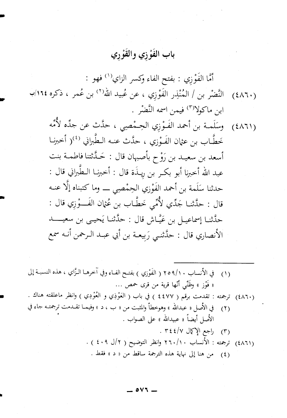 4860 - النَّضر بن الْمُنْذر الفوزي عَن عبيد الله بن عمر ذكره ابْن مَاكُولَا فِيمَن اسْمه النَّضر