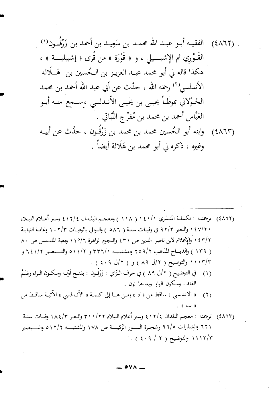 4862 - الْفَقِيه أَبُو عبد الله مُحَمَّد بن سعيد بن أَحْمد بن زرقون الفوري ثمَّ الإشبيلي وقورة من قرى إشبيلية هَكَذَا قَالَه لي أَبُو مُحَمَّد عبد الْعَزِيز بن الْحُسَيْن بن هلاله الأندلسي رَحمَه الله حدث عَن أبي عبد الله احْمَد بن مُحَمَّد الْخَولَانِيّ بموطأ يحيى بن يحيى الأندلسي سمع مِنْهُ أَبُو الْعَبَّاس احْمَد بن مُحَمَّد بن مفرج النباتي