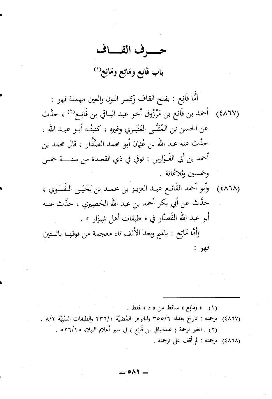 4867 - أَحْمد بن قَانِع بن مَرْزُوق أَخُو عبد الْبَاقِي بن قَانِع حدث عَن الْحسن بن الْمثنى الْعَنْبَري وَغَيره كنيته ابو عبد الله حدث عَنهُ عبد الله بن عُثْمَان أَبُو مُحَمَّد الصفار قَالَ مُحَمَّد بن أَحْمد بن أبي الفوارس توفّي فِي ذِي الْقعدَة من سنة خمس وَخمسين وثلاثمائة