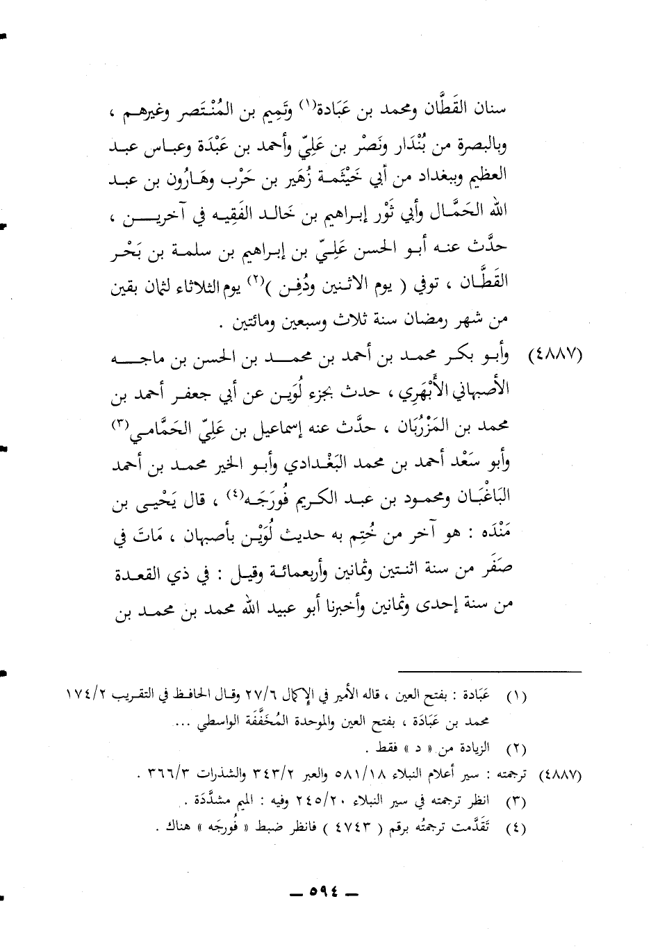 4887 - وَأَبُو بكر بن أَحْمد بن مُحَمَّد بن الْحسن بن مَاجَه الْأَصْبَهَانِيّ الْأَبْهَرِيّ حدث بِجُزْء لوين عَن أبي جَعْفَر أَحْمد بن مُحَمَّد بن المزربان حدث عَنهُ إِسْمَاعِيل بن عَليّ الحمامي وَأَبُو سعد أَحْمد بن مُحَمَّد الْبَغْدَادِيّ وَأَبُو الْخَيْر مُحَمَّد بن أَحْمد الباغبان ومحمود بن عبد الْكَرِيم فورجه قَالَ يحيى بن مَنْدَه هُوَ آخر من ختم بِهِ حَدِيث لوين بأصبهان مَاتَ فِي صفر من سنة اثْنَتَيْنِ وَثَمَانِينَ وَأَرْبَعمِائَة وَقيل فِي ذِي الْقعدَة من سنة إِحْدَى وَثَمَانِينَ وَأخْبرنَا أَبُو عبيد الله مُحَمَّد بن مُحَمَّد بن