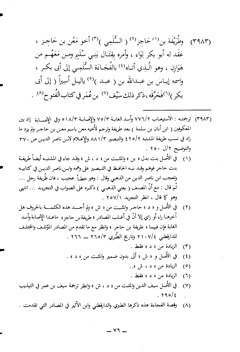 3983 - وطريفة بن حاجز السّلمِيّ اخو معن بن حاجز عقد لَهُ أَبُو بكر لِوَاء وَأمره بِقِتَال بني سليم وَمن مَعَهم من هوَازن وَهُوَ الَّذِي أَتَاهُ بالفجاءة السّلمِيّ إِلَى أبي بكر واسْمه إِيَاس بن عبد الله بن عبد ياليل اسيرا إِلَى أبي بكر فحرقه ذكر سيف بن عمر فِي كتاب الْفتُوح