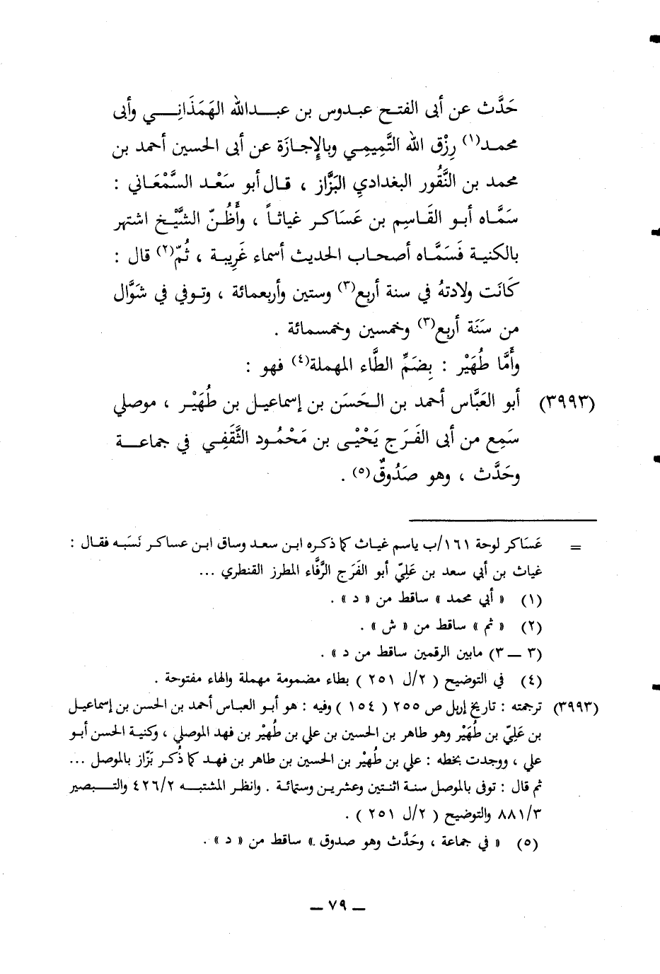 3993 - أَبُو الْعَبَّاس أَحْمد بن الْحسن بن إِسْمَاعِيل بن طهير موصلي سمع من ابي الْفرج يحيى بن مَحْمُود الثَّقَفِيّ فِي جمَاعَة وَحدث وَهُوَ صَدُوق