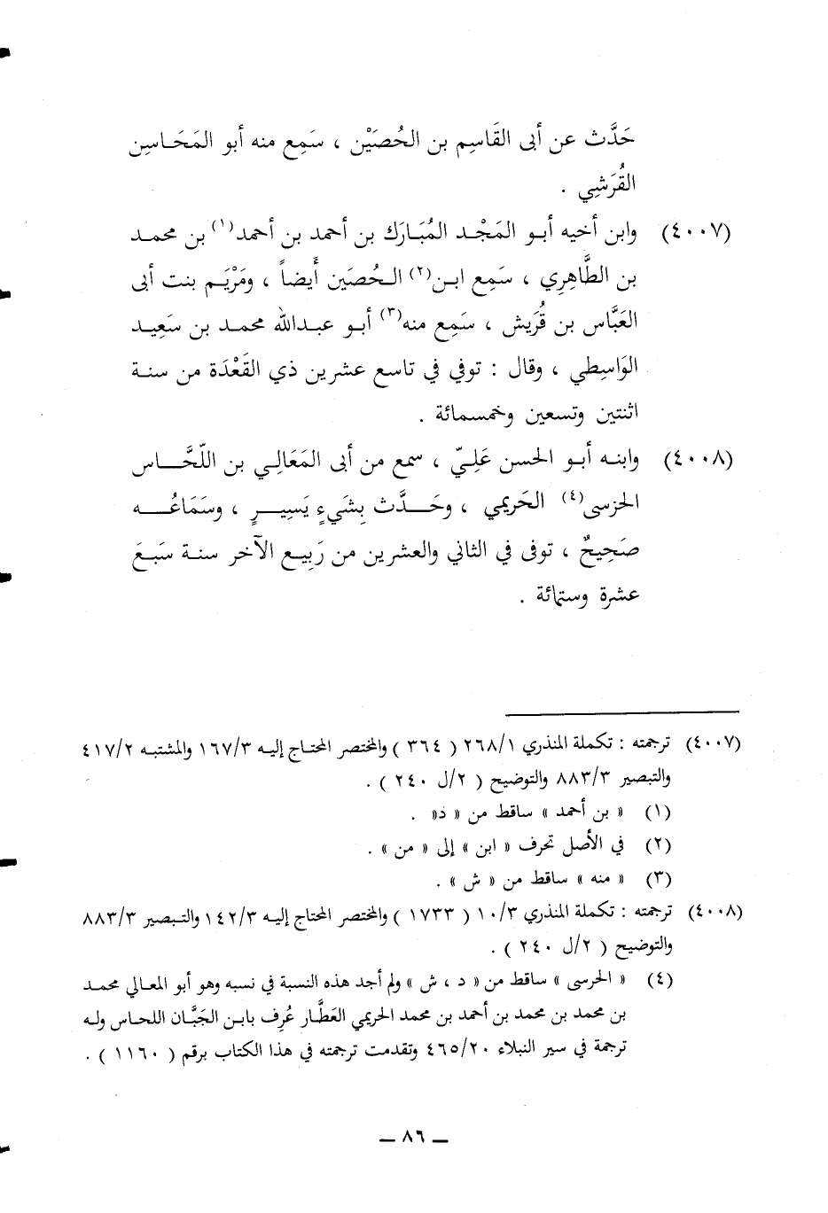 4007 - وَابْن أَخِيه أَبُو الْمجد الْمُبَارك بن أَحْمد بن أَحْمد بن مُحَمَّد بن الطاهري سمع ابْن الْحصين أَيْضا وَمَرْيَم بنت أبي الْعَبَّاس من قُرَيْش سمع مِنْهُ أَبُو عبد الله مُحَمَّد بن سعيد الوَاسِطِيّ وَقَالَ توفّي فِي تَاسِع عشْرين ذِي الْقعدَة من سنة اثْنَتَيْنِ وَتِسْعين وَخَمْسمِائة