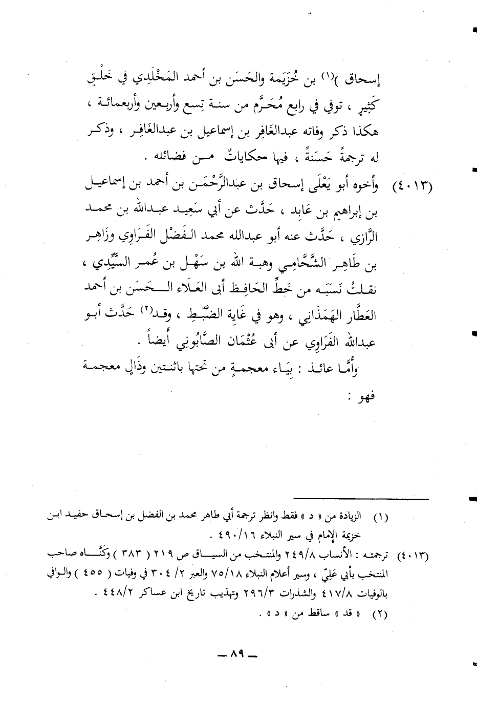 4013 - وَأَخُوهُ ابو يعلى اسحاق بن عبد الرَّحْمَن بن احْمَد بن اسماعيل بن ابراهيم بن عَابِد حدث عَن أبي سعيد عبد الله بن مُحَمَّد الرَّازِيّ حدث عَنهُ أَبُو عبد الله مُحَمَّد الْفضل الفراوي وزاهر بن طَاهِر الشحامي وَهبة الله بن سهل بن عمر السيدي نقلت نسبه من خطّ الْحَافِظ ابي الْعَلَاء الْحسن بن أَحْمد الْعَطَّار الهمذاني وَهُوَ فِي غَايَة الضَّبْط وَقد حدث أَبُو عبد الله الفراوي عَن أبي عُثْمَان الصَّابُونِي أَيْضا