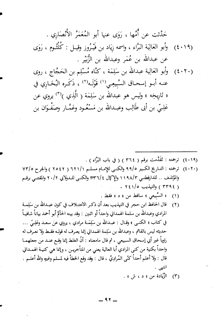 4020 - وَأَبُو الْعَالِيَة عبد الله بن سَلمَة كناه مُسلم بن الْحجَّاج روى عَنهُ أَبُو إِسْحَاق السبيعِي قَوْله ذكره البُخَارِيّ فِي تَارِيخه وَلَيْسَ هُوَ عبد الله بن سَلمَة الَّذِي يرْوى عَن عَليّ بن أبي طَالب وَعبد الله بن مَسْعُود وعمار وَصَفوَان بن عَسَّال الَّذِي يروي عَنهُ عَمْرو بن مرّة فرق البُخَارِيّ وَمُحَمّد بن عبد الله بن نمير بَينهمَا