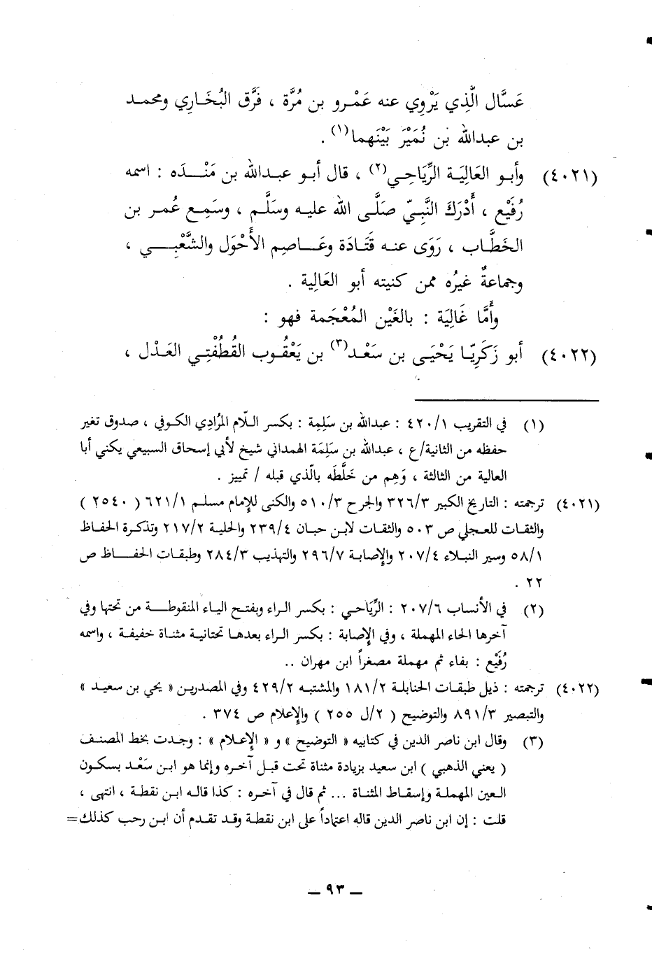 4021 - وَأَبُو الْعَالِيَة الريَاحي قَالَ أَبُو عبد الله بن مَنْدَه اسْمه رفيع أدْرك النَّبِي صلى الله عَلَيْهِ وَسلم وَسمع عمر بن الْخطاب روى عَنهُ قَتَادَة وَعَاصِم الْأَحول وَالشعْبِيّ وَجَمَاعَة غَيره مِمَّن كنيته أَبُو الْعَالِيَة