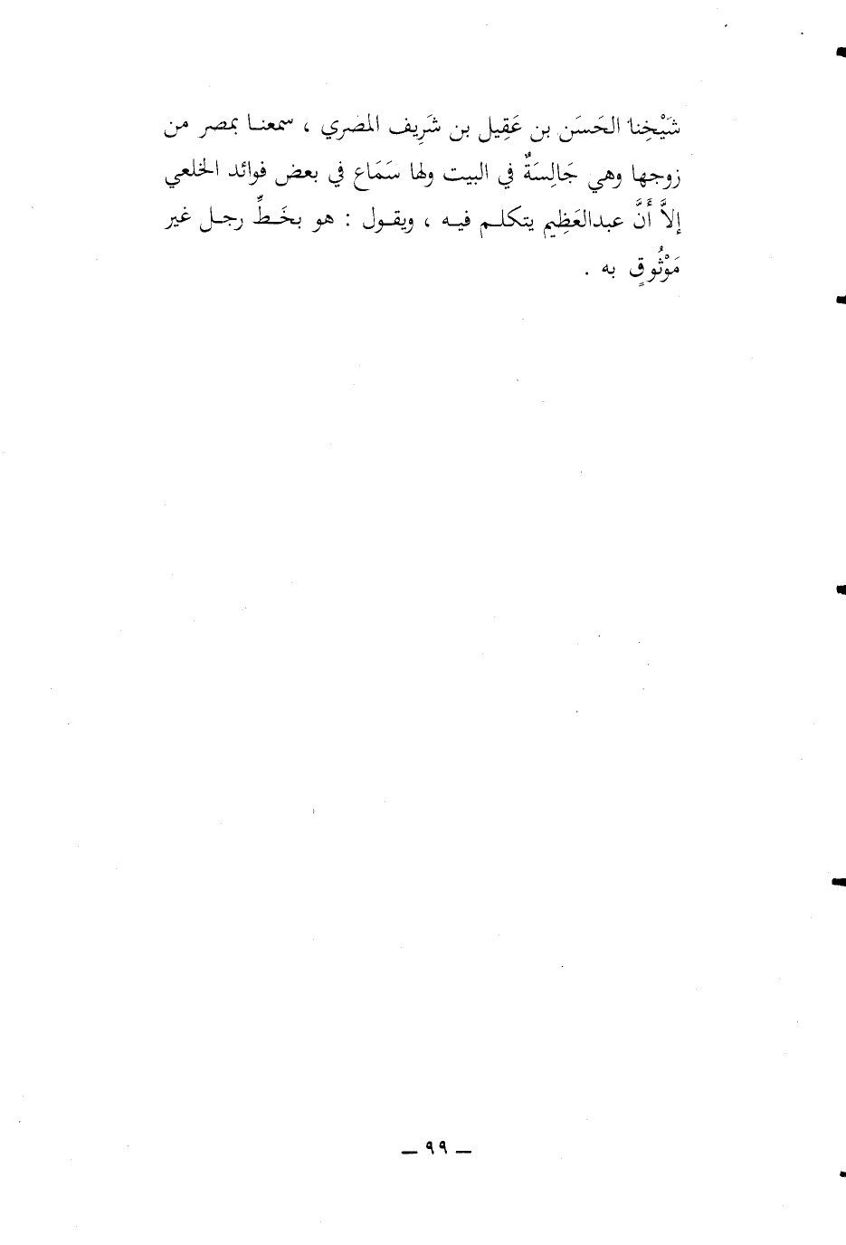 شَيخنَا الْحسن بن عقيل بن شرِيف الْمصْرِيّ سمعنَا بِمصْر من زَوجهَا وَهِي جالسة فِي الْبَيْت وَلها سَماع فِي بعض فَوَائِد الخلعي إِلَّا أَن عبد الْعَظِيم يتَكَلَّم فِيهِ وَيَقُول هُوَ بِخَط رجل غير موثوق بِهِ