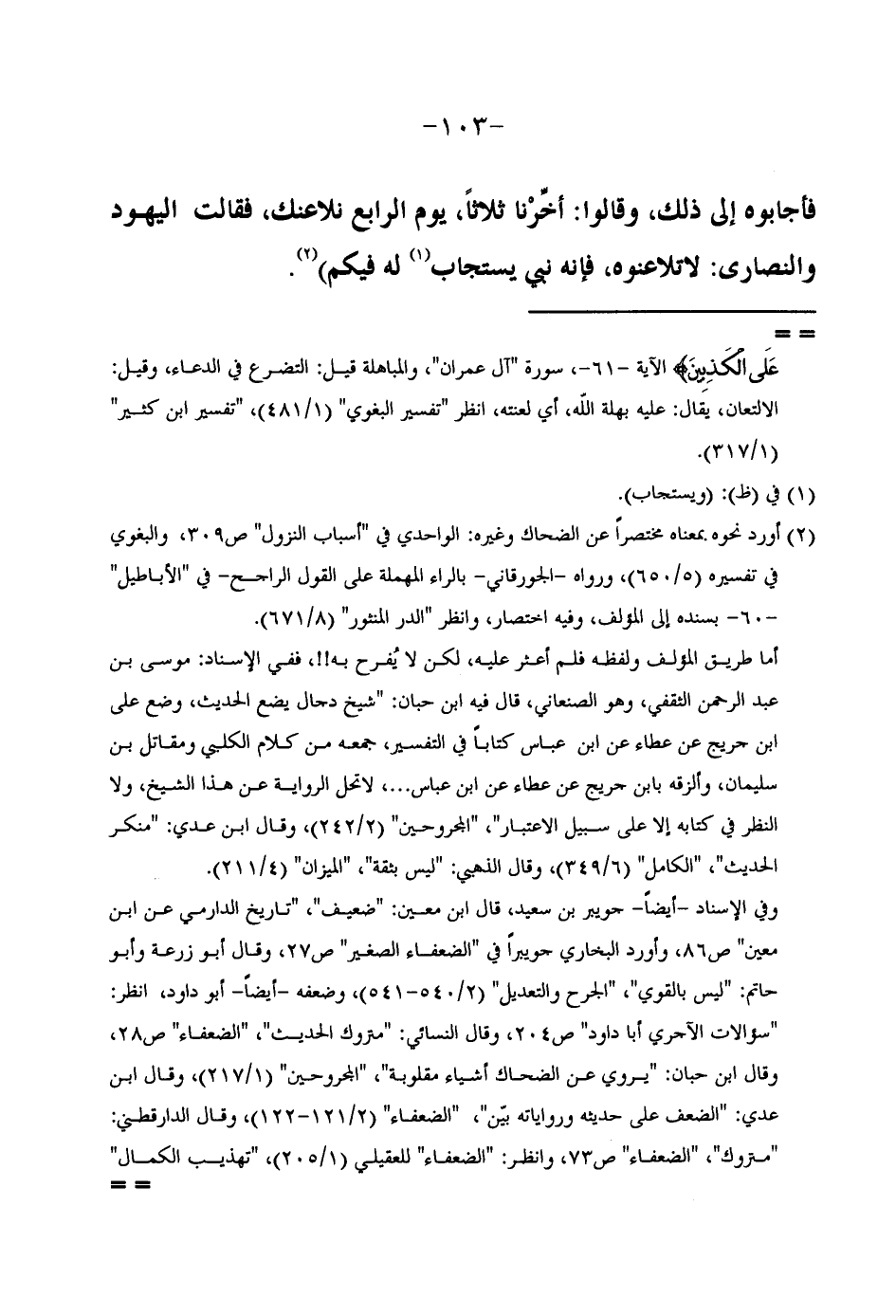 فَأَجَابُوهُ إِلَى ذَلِكَ وَقَالُوا أَخِّرْنَا ثَلَاثًا يَوْمَ الرَّابِعِ نُلَاعِنُكَ فَقَالَتِ الْيَهُودُ وَالنَّصَارَى لَا تُلَاعِنُوهُ فِإِنَّهُ نَبِي يُسْتَجَاب لَهُ فِيكُم // أورد نَحوه بِمَعْنَاهُ مُخْتَصرا عَن الضَّحَّاك وَغَيره الواحدي فِي أَسبَاب النُّزُول وَالْبَغوِيّ //