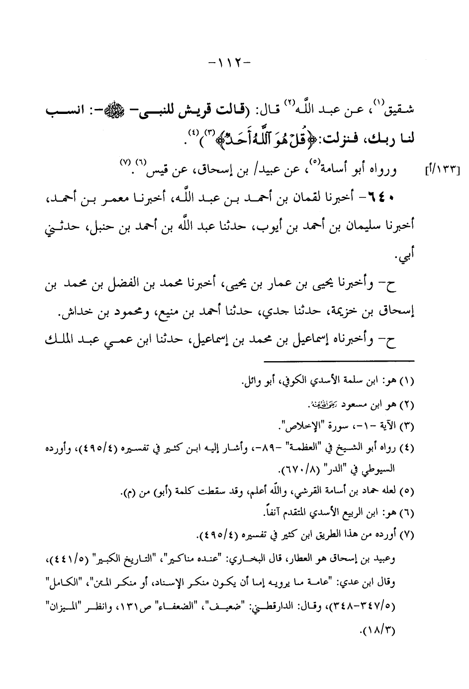 شَقِيقٍ عَنْ عَبْدِ اللَّهِ قَالَ (قَالَتْ قُرَيْشٌ لِلنَّبِيِّ صَلَّى اللَّهُ عَلَيْهِ وَسَلَّمَ انْسِبْ لَنَا رَبَّكَ فَنَزَلَتْ {قُلْ هُوَ اللَّهُ أَحَدٌ} // رَوَاهُ أَبُو الشَّيْخ فِي العظمة وَأَشَارَ إِلَيْهِ ابْن كثير فِي تَفْسِيره وَأوردهُ //