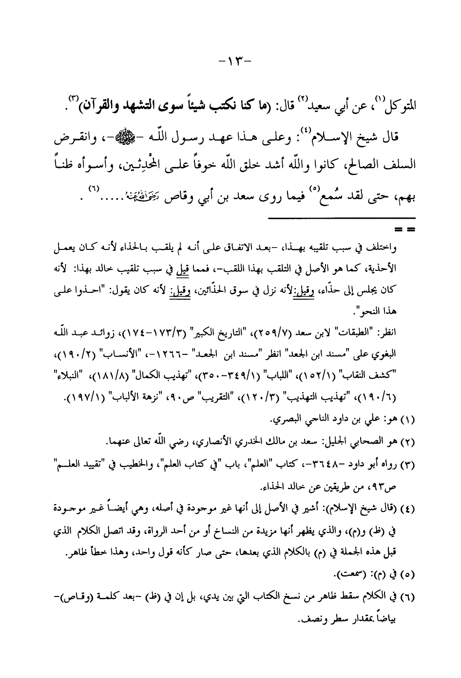الْمُتَوَكِّلِ عَنْ أَبِي سَعِيدٍ قَالَ (مَا كُنَّا نَكْتُبُ شَيْئًا سِوَى التَّشَهُّد وَالْقُرْآن) رَوَاهُ أَبُو دَاوُد كتاب الْعلم بَاب فِي كتاب الْعلم والخطيب فِي تَقْيِيد الْعلم