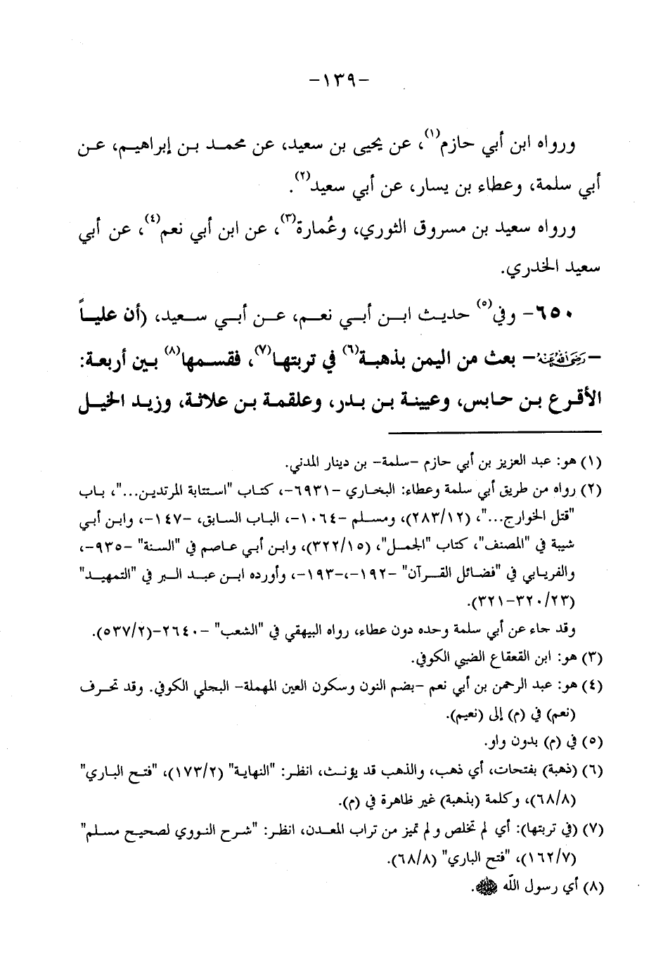 650 - وَفِي حَدِيثِ ابْنِ أَبِي نُعْمٍ عَنْ أَبِي سَعِيدٍ (أَنَّ عَلِيًّا رَضِيَ اللَّهُ عَنْهُ بَعَثَ مِنَ الْيَمَنِ بِذَهَبَةٍ فِي تُرْبَتِهَا فَقَسَمَهَا بَيْنَ أَرْبَعَةٍ الْأَقْرَعِ بْنِ حَابِسٍ وَعُيَيْنَةَ بْنِ بَدْرٍ وَعَلْقَمَةَ بْنِ عُلَاثَةَ وَزَيْدِ الْخَيْلِ