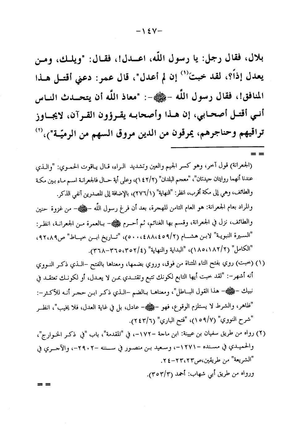 بِلَالٍ فَقَالَ رَجُلٌ يَا رَسُولَ اللَّهِ اعْدِلْ فَقَالَ وَيْلَكَ وَمَنْ يَعْدِلُ إِذًا لَقَدْ خِبْتُ إِنْ لَمْ أَعْدِلُ قَالَ عُمَرُ دَعْنِي أَقْتُلْ هَذَا الْمُنَافِقَ فَقَالَ رَسُولُ اللَّهِ صَلَّى اللَّهُ عَلَيْهِ وَسَلَّمَ مَعَاذَ اللَّهِ أَنْ يَتَحَّدَثَ النَّاسُ أَنِّي أَقْتُلُ أَصْحَابِي إِنَّ هَذَا وَأَصْحَابه يقرؤون الْقُرْآنَ لَا يُجَاوِزُ تَرَاقِيهِمْ وَحَنَاجِرِهِمْ يَمْرُقُونَ مِنَ الدِّينِ مُرُوقَ السَّهْمِ من الرَّمية) // رَوَاهُ من طَرِيق سُفْيَان بن عُيَيْنَة ابْن ماجة فِي الْمُقدمَة بَاب فِي ذكر الْخَوَارِج //
