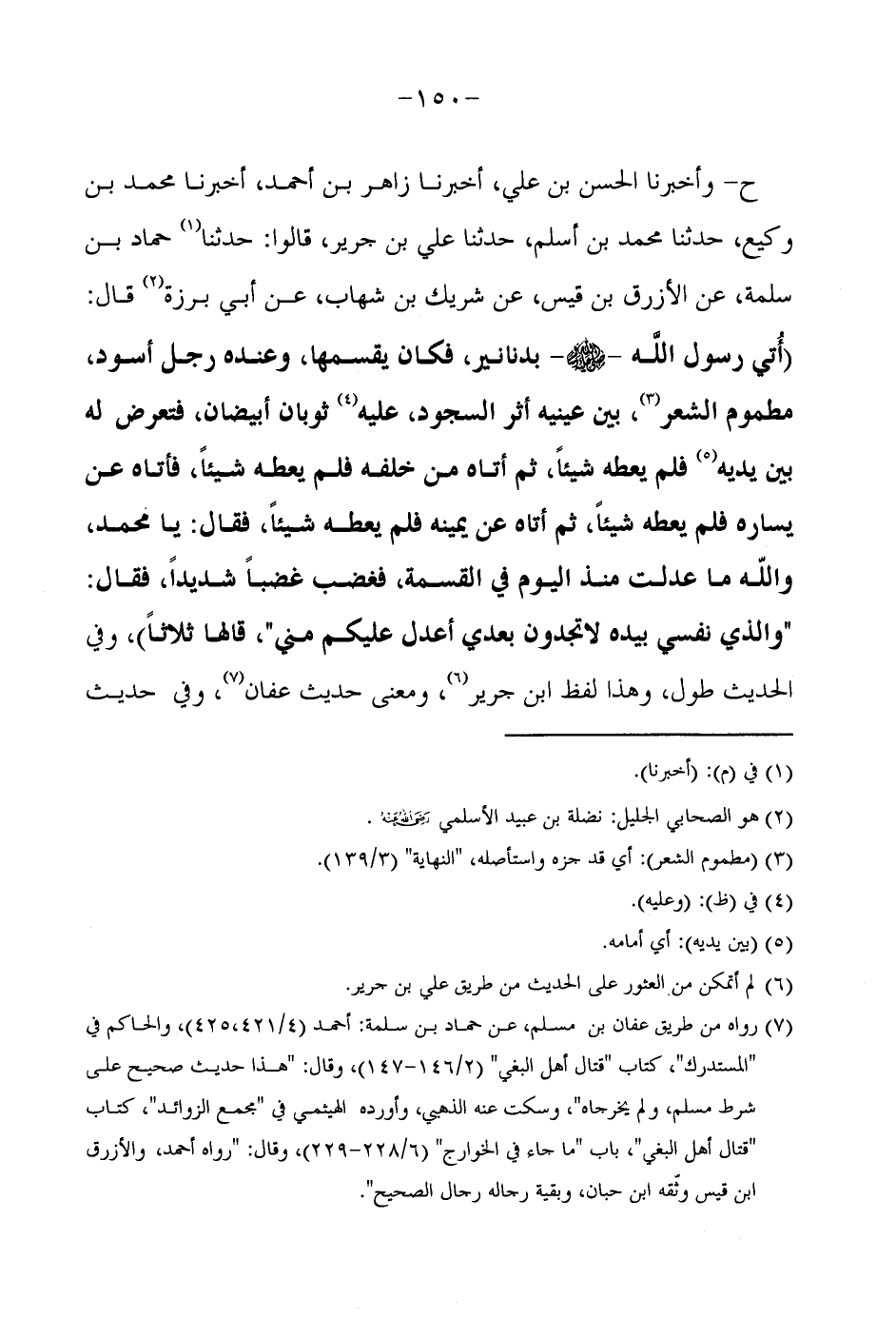 ح وَأَخْبَرَنَا الْحَسَنُ بْنُ عَلِيٍّ أَخْبَرَنَا زَاهِرُ بْنُ أَحْمَدَ أَخْبَرَنَا مُحَمَّدُ بْنُ وَكِيعٍ حَدَّثَنَا مُحَمَّدُ بْنُ أَسْلَمَ حَدَّثَنَا عَلِيُّ بْنُ جَرِيرٍ قَالُوا حَدَّثَنَا حَمَّادُ بْنُ سَلَمَةَ عَنِ الْأَزْرَقِ بْنِ قَيْسٍ عَنْ شَرِيكِ بْنِ شِهَابٍ عَنْ أَبِي بَرْزَةَ قَالَ (أُتِيَ رَسُولُ اللَّهِ صَلَّى اللَّهُ عَلَيْهِ وَسَلَّمَ بِدَنَانِيرَ فَكَانَ يُقَسِّمُهَا وَعِنْدَهُ رَجُلٌ أَسْوَدٌ مَطْمُومُ الشَّعْرِ بَيْنَ عَيْنَيْهِ أَثَرُ السُّجُودِ عَلَيْهِ ثَوْبَانِ أَبْيَضَانِ فَتَعَرَّضَ لَهُ بَيْنَ يَدَيْهِ فَلَمْ يُعْطِهِ شَيْئًا ثُمَّ أَتَاهُ مِنْ خَلفه فَلم يُعْطه شَيْئا فَأَتَاهُ عَن يسَاره فَلَمْ يُعْطِهِ شَيْئًا ثُمَّ أَتَاهُ عَن يَمِينه فَلَمْ يُعْطِهِ شَيْئًا فَقَالَ يَا مُحَمَّدُ وَاللَّهِ مَا عَدَلْتَ مُنْذُ الْيَوْمِ فِي الْقِسْمَةِ فَغَضِبَ غَضَبًا شَدِيدًا فَقَالَ وَالَّذِي نَفْسِي بِيَدِهِ لَا تَجِدُونَ بَعْدِي أَعْدَلَ عَلَيْكُمْ مِنِّي قَالَهَا ثَلَاثًا) وَفِي الْحَدِيثِ طُولٌ وَهَذَا لَفْظُ ابْنِ جَرِيرٍ وَمَعْنَى حَدِيثِ عَفَّانَ وَفِي حَدِيثِ
