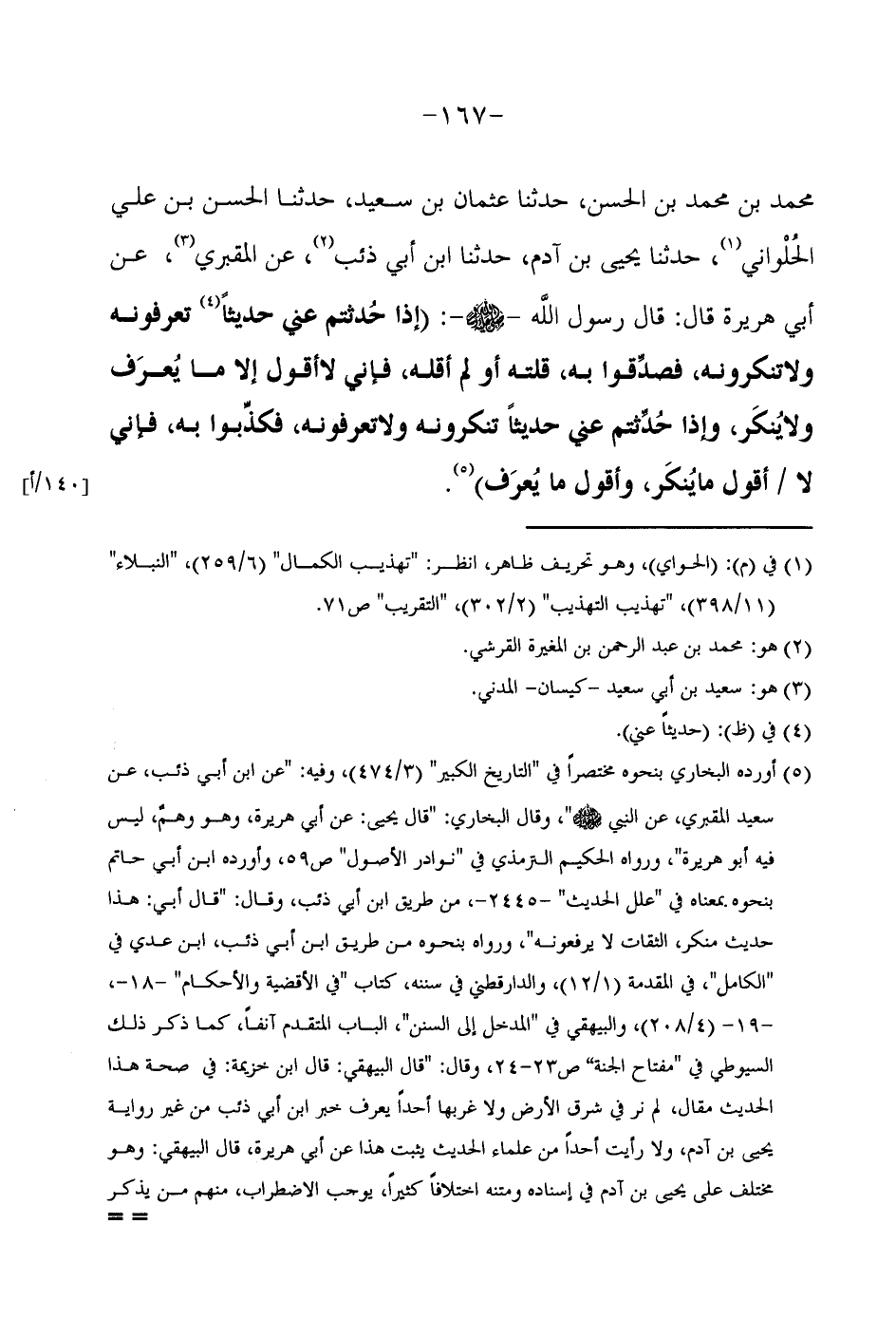 مُحَمَّدِ بْنِ مُحَمَّدِ بْنِ الْحَسَنِ حَدَّثَنَا عُثْمَانُ بْنُ سَعِيدٍ حَدَّثَنَا الْحَسَنُ بْنُ عَلِيٍّ الْحَلْوَانِيُّ حَدَّثَنَا يَحْيَى بْنُ آدَمَ حَدَّثَنَا ابْنُ أَبِي ذِئْبٍ عَنِ الْمَقْبُرِيِّ عَنْ أَبِي هُرَيْرَةَ قَالَ قَالَ رَسُولُ اللَّهِ صَلَّى اللَّهُ عَلَيْهِ وَسَلَّمَ (إِذَا حُدِّثْتُمْ عَنِّي حَدِيثًا تَعْرِفُونَهُ وَلَا تُنْكِرُونَهُ فَصَدِّقُوا بِهِ قُلْتُهُ أَوْ لَمْ أَقُلْهُ فَإِنِّي لَا أَقُولُ إِلَّا مَا يُعرَفُ وَلَا يُنكَرُ وَإِذَا حُدِّثْتُمْ عَنِّي حَدِيثًا تُنْكِرُونَهُ وَلَا تَعْرِفُونَهُ فَكَذِّبُوا بِهِ فَإِنِّي لَا أَقُولُ مَا يُنْكَرُ وَأَقُول مَا يعرف) // أوردهُ البُخَارِيّ بِنَحْوِهِ مُخْتَصرا فِي التَّارِيخ الْكَبِير وَفِيه عَن ابْن أبي ذِئْب عَن سعيد المَقْبُري //