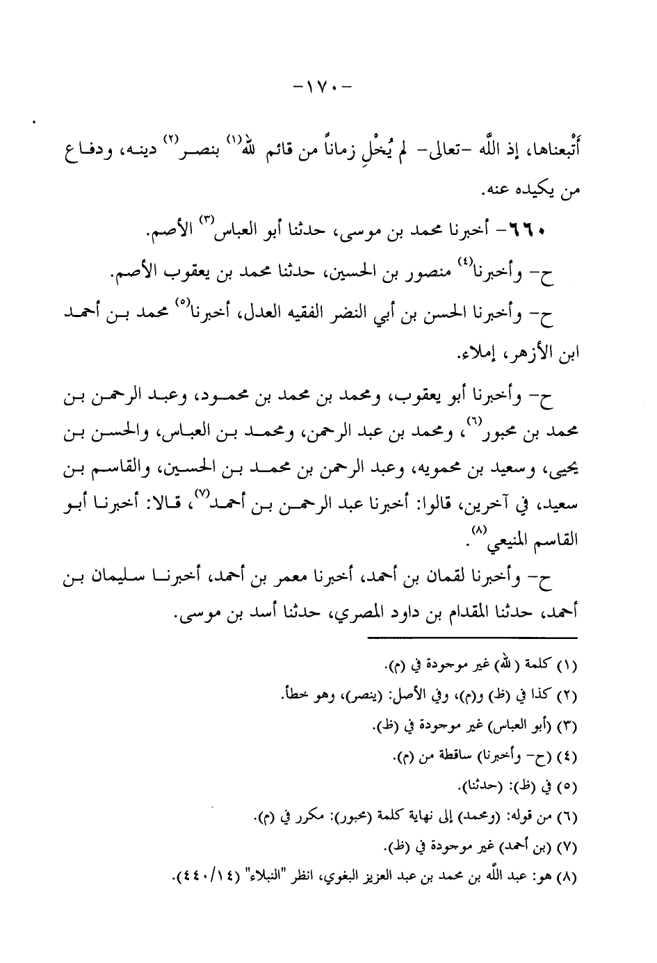 ح وَأَخْبَرَنَا أَبُو يَعْقُوبَ وَمُحَمَّدُ بْنُ مُحَمَّدِ بْنِ مَحْمُودٍ وَعَبْدُ الرَّحْمَنِ بْنُ مُحَمَّدِ بْنِ مَحْبُورٍ وَمُحَمَّدُ بْنُ عَبْدِ الرَّحْمَنِ وَمُحَمَّدُ بْنُ الْعَبَّاسِ وَالْحَسَنُ بْنُ يَحْيَى وَسَعِيدُ بْنُ مَحْمَوَيْهِ وَعَبْدَ الرَّحْمَنِ بْنَ مُحَمَّدِ بْنِ الْحُسَيْنِ وَالْقَاسِمُ بْنُ سَعِيدٍ فِي آخَرِينَ قَالُوا أَخْبَرَنَا عَبْدُ الرَّحْمَنِ بْنُ أَحْمَدَ قَالَا أَخْبَرَنَا أَبُو الْقَاسِمِ الْمَنِيعِيُّ