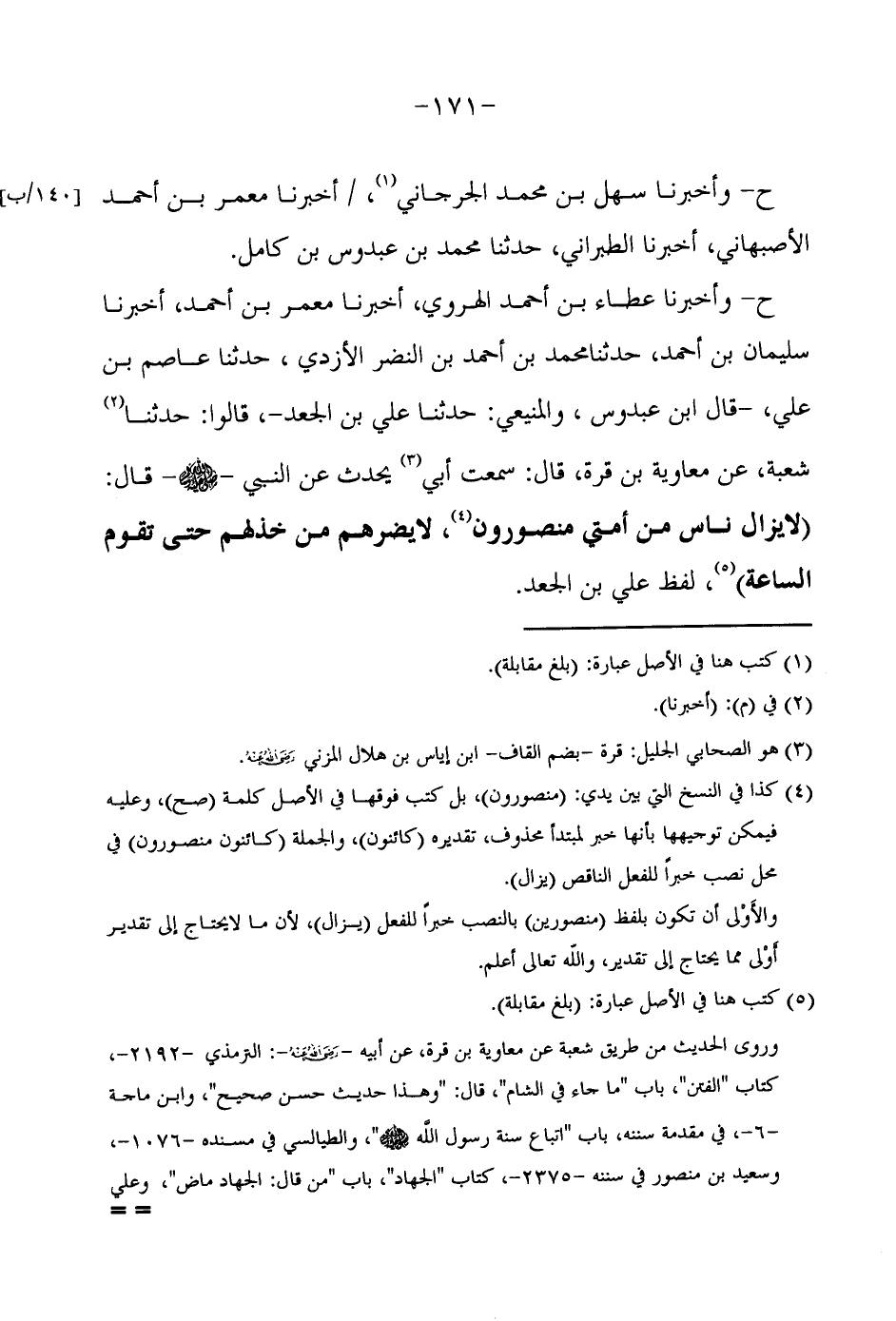 ح وَأَخْبَرَنَا عَطَاءُ بْنُ أَحْمَدَ الْهَرَوِيُّ أَخْبَرَنَا مَعْمَرُ بْنُ أَحْمَدَ أَخْبَرَنَا سُلَيْمَانُ بْنُ أَحْمَدَ حَدَّثَنَا مُحَمَّدُ بْنُ أَحْمَدَ بْنِ النَّضْرِ الْأَزْدِيُّ حَدَّثَنَا عَاصِمُ بْنُ عَلِيٍّ قَالَ ابْنُ عَبْدُوسٍ وَالْمَنِيعِيُّ حَدَّثَنَا عَلِيُّ بْنُ الْجَعْدِ قَالُوا حَدَّثَنَا شُعْبَةُ عَنْ مُعَاوِيَةَ بْنِ قُرَّةَ قَالَ سَمِعْتُ أَبِي يُحَدِّثُ عَنِ النَّبِيِّ صَلَّى اللَّهُ عَلَيْهِ وَسَلَّمَ قَالَ (لَا يَزَالُ نَاسٌ مِنْ أُمَّتِي مَنْصُورُونَ لَا يَضُرُّهُمْ مَنْ خَذَلَهُمْ حَتَّى تقوم السَّاعَة) // وروى الحَدِيث من طَرِيق شُعْبَةُ عَنْ مُعَاوِيَةَ بْنِ قُرَّةَ عَنْ أَبِيهِ رَضِيَ اللَّهُ عَنْهُ التِّرْمِذِيّ // لَفْظُ عَلِيِّ بْنِ الْجَعْدِ
