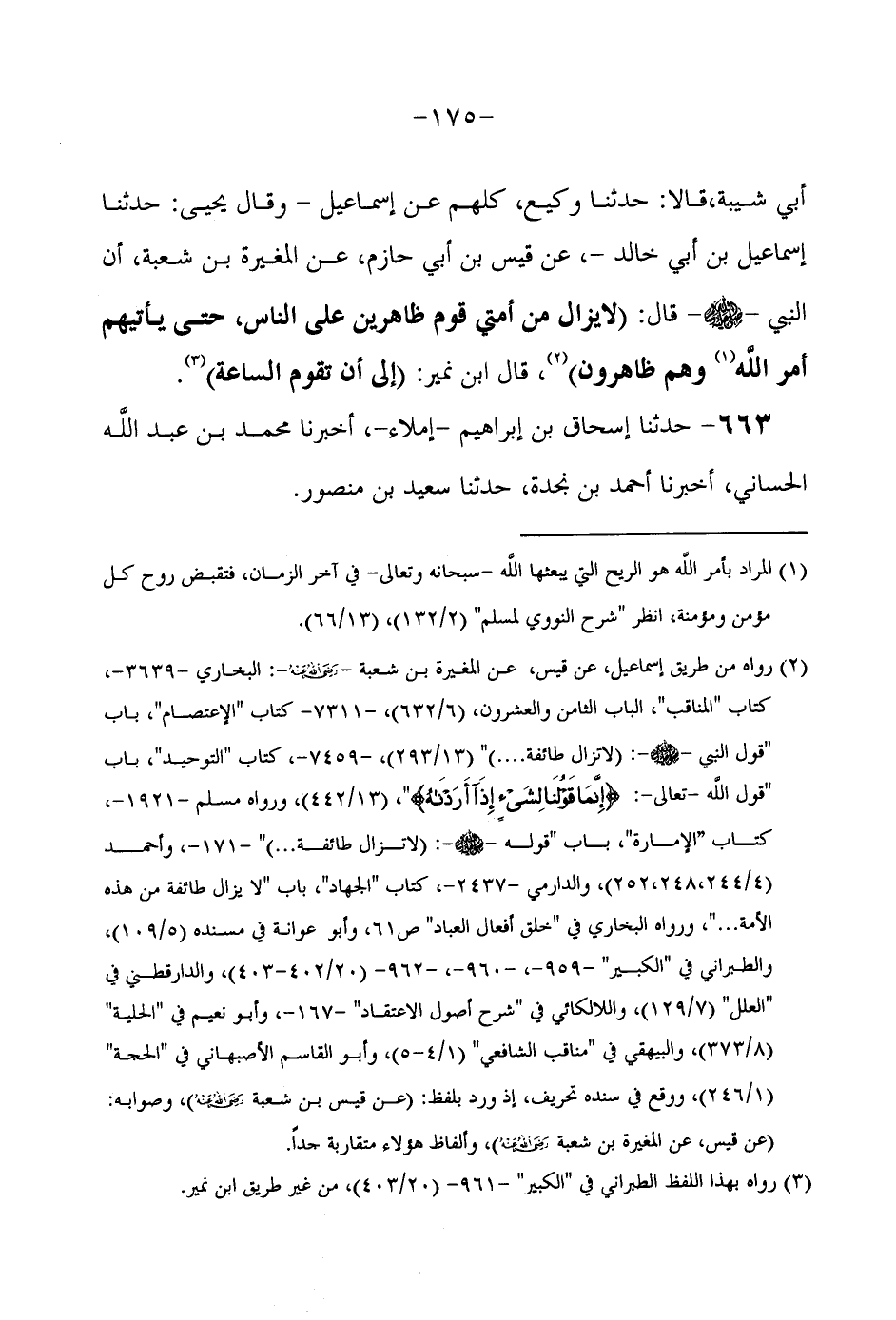 أَبِي شَيْبَةَ قَالَا حَدَّثَنَا وَكِيعٌ كُلُّهُمْ عَنْ إِسْمَاعِيلَ وَقَالَ يَحْيَى حَدَّثَنَا إِسْمَاعِيلُ بْنُ أَبِي خَالِدٍ عَنْ قَيْسِ بْنِ أَبِي حَازِمٍ عَنِ الْمُغِيرَةِ بْنِ شُعْبَةٍ أَنّ النَّبِيِّ صَلَّى اللَّهُ عَلَيْهِ وَسَلَّمَ قَالَ (لَا يَزَالُ مِنْ أُمَّتِي قَوْمٌ ظَاهِرِينَ عَلَى النَّاسِ حتَّى يَأْتِيهِمْ أَمْرُ اللَّهِ وَهُمْ ظَاهِرُونَ) // رَوَاهُ من طَرِيق إِسْمَاعِيل عَن قيس عَن الْمُغيرَة بن شُعْبَة رَضِي الله عَنهُ البُخَارِيّ قَالَ ابْن النمير (إِلَى أَنْ تَقُومَ السَّاعَةُ) //