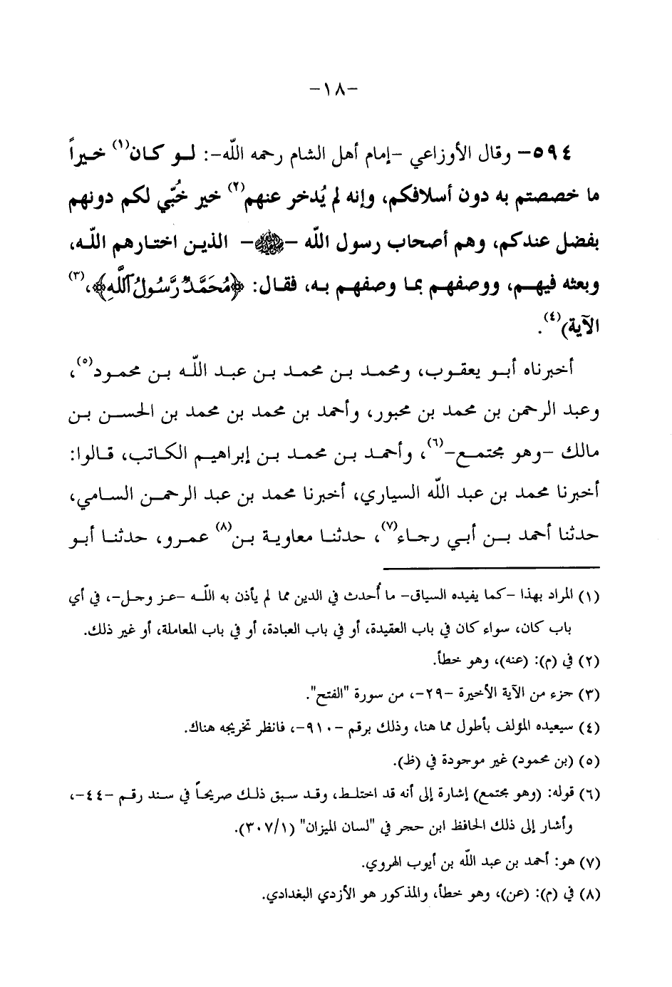 594 - وَقَالَ الْأَوْزَاعِيُّ إِمَامُ أَهْلِ الشَّامِ رَحِمَهُ اللَّهُ (لَوْ كَانَ خَيْرًا مَا خُصِصْتُمْ بِهِ دُونَ أَسْلَافِكُمْ وَإنَّهُ لم يدّخر عَنْهُم وَهُوَ خطأ خير خبي لَكُمْ دُونَهُمْ بِفَضْلٍ عِنْدَكُمْ وَهُمْ أَصْحَابِ رَسُولِ اللَّهِ صَلَّى اللَّهُ عَلَيْهِ وَسَلَّمَ الَّذِينَ اخْتَارَهُمُ اللَّهُ وَبَعَثَهُ فِيهِمْ وَوَصَفَهُمْ بِمَا وَصَفَهُمْ بِهِ فَقَالَ (مُحَمَّدٌ رَسُولُ اللَّهِ) الآيه)