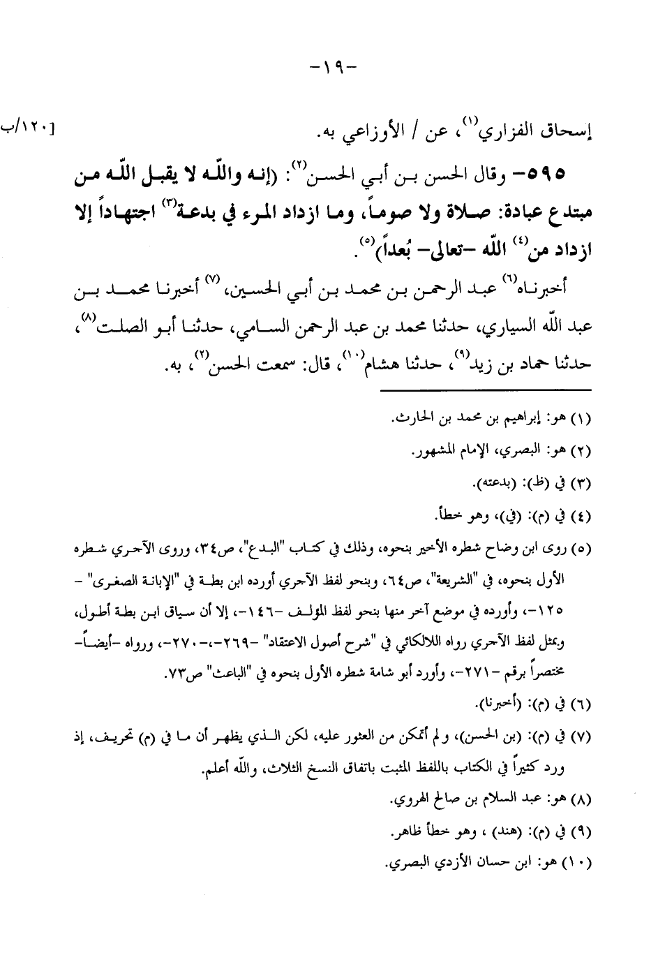 595 - وَقَالَ الْحَسَنُ بْنُ أَبِي الْحَسَنِ (إِنَّهُ وَاللَّهِ لَا يَقْبَلُ اللَّهُ مِنْ مُبْتَدِعٍ عِبَادَةً صَلَاةً وَلَا صَوْمًا وَمَا ازْدَادَ الْمَرْءُ فِي بِدْعَةٍ اجْتِهَادًا إِلَّا ازْدَادَ مِنَ الله تَعَالَى بعدا) روى ابْن وضاح شطره الْأَخير بِنَحْوِهِ وَذَلِكَ فِي كتاب الْبدع وروى الْآجُرِيّ شطره